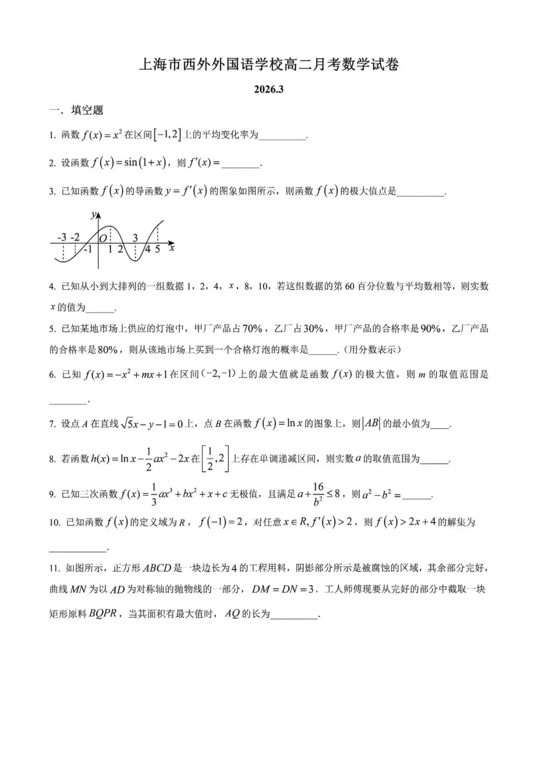 >上海市市西外国语学校高二下学期数学月考试卷及答案(2026.3)