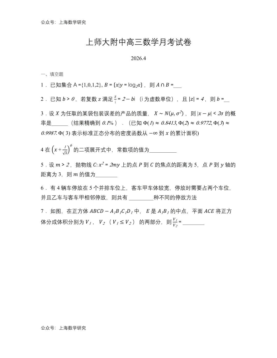 上海中学东校七年级数学素养评估试卷(2026.4)