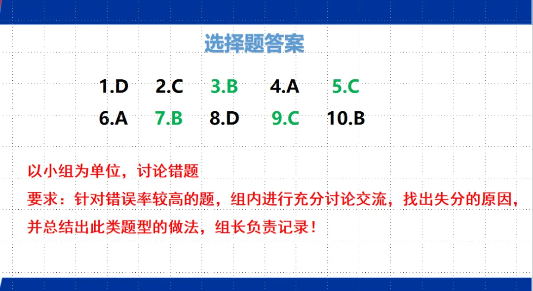 三位老师备课比较充分,三节课均有学生试卷、答题卡及讲评课件。三节课都能结合学情设计,体现了讲评课的核心流程“自主订正—小组研讨—典型题精讲—反思总结”。虽然课堂中存在不足及需要改进的地方,但在房老师几次的听评课指导下,我们的讲评课也更加的规范和高效。