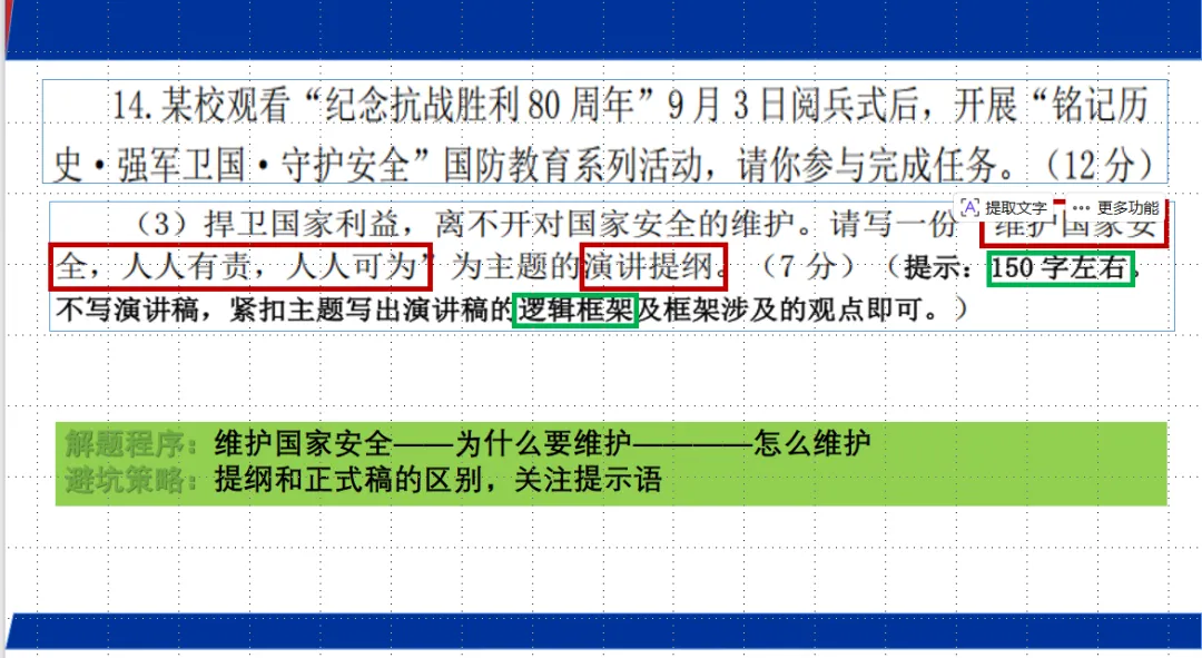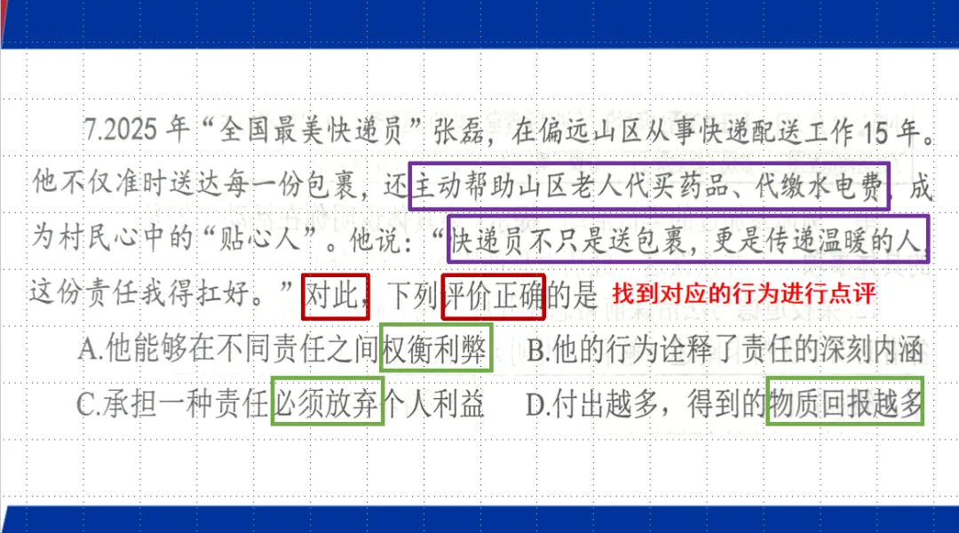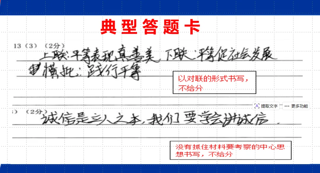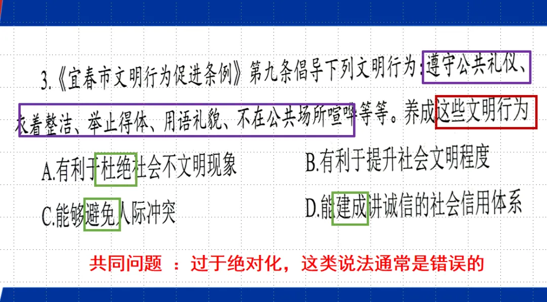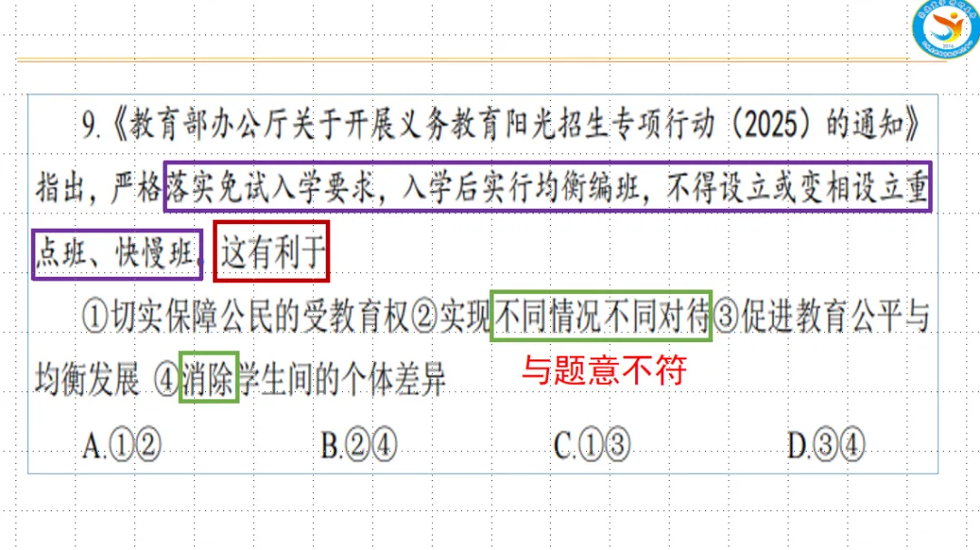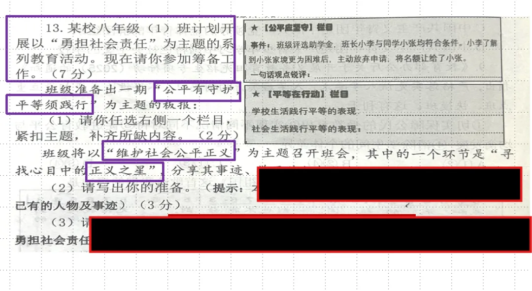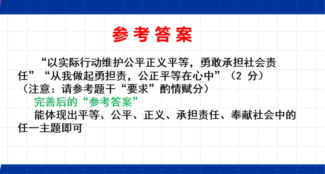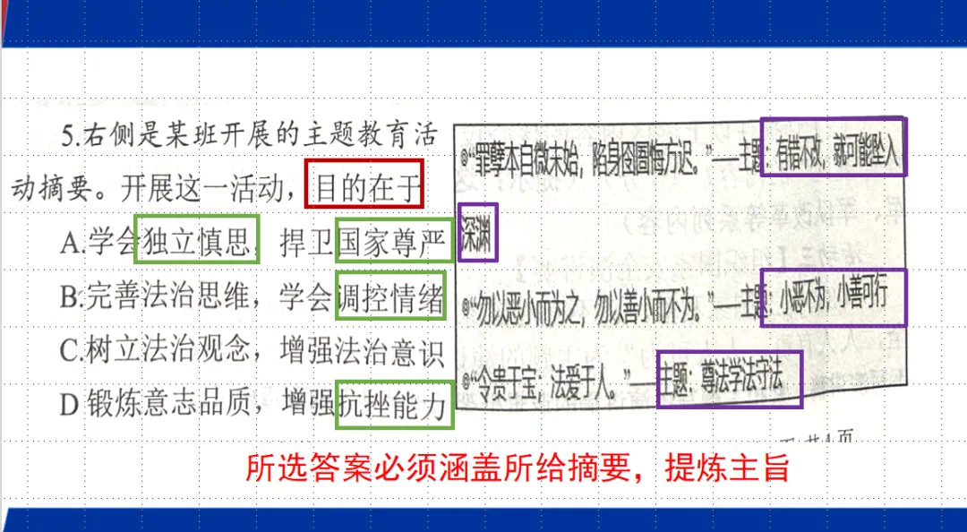 其次,我们应从做题方法得出“要归纳学(归类)”。对于同质材料(指向背后的本质)要用同质思维来解决问题,要善于归纳同质观念/观点解决相似问题。比如七年级13(2)、八年级14(1).