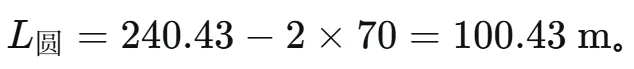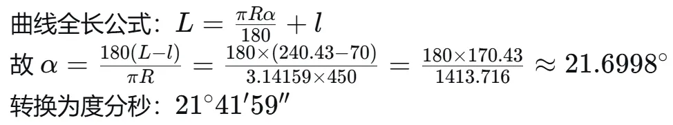 已知某曲线,设计曲线全长L=240.43m,曲线半径R=450m,缓和曲线长l~1~=l~2~=70m。试计算曲线转角、外股钢轨伸长量,并用从曲中分点的方法在下图中标出外股钢轨上五大桩的位置。(转角用“°′″”表示;曲线每10m设置一个测点,起点号数为1点,图示标出五大桩相邻测点号数及距离)