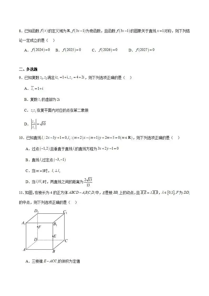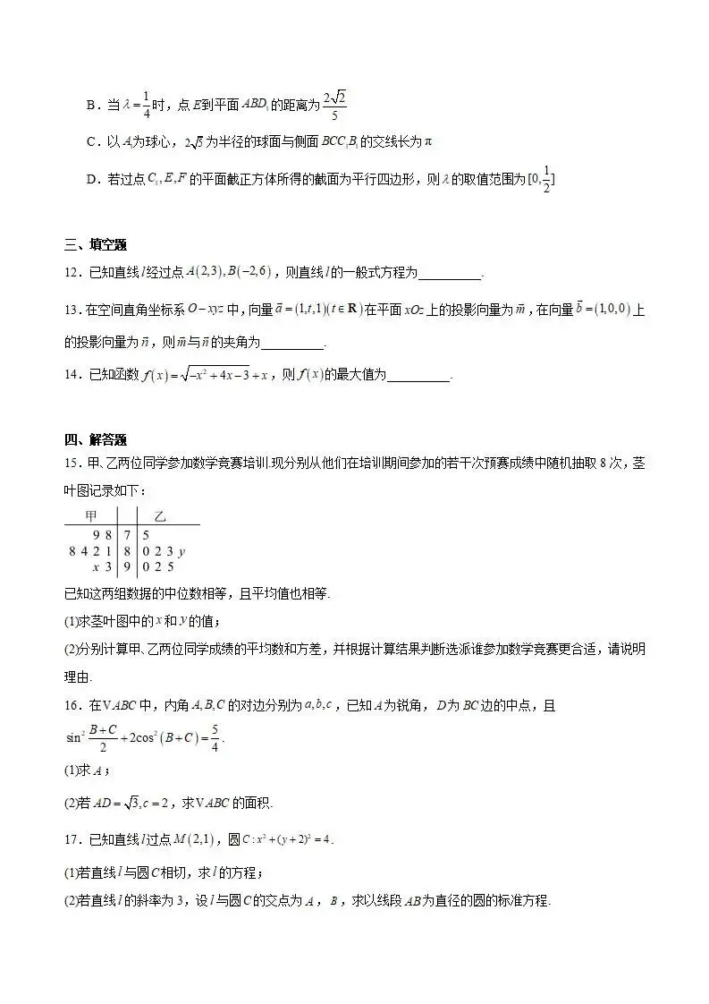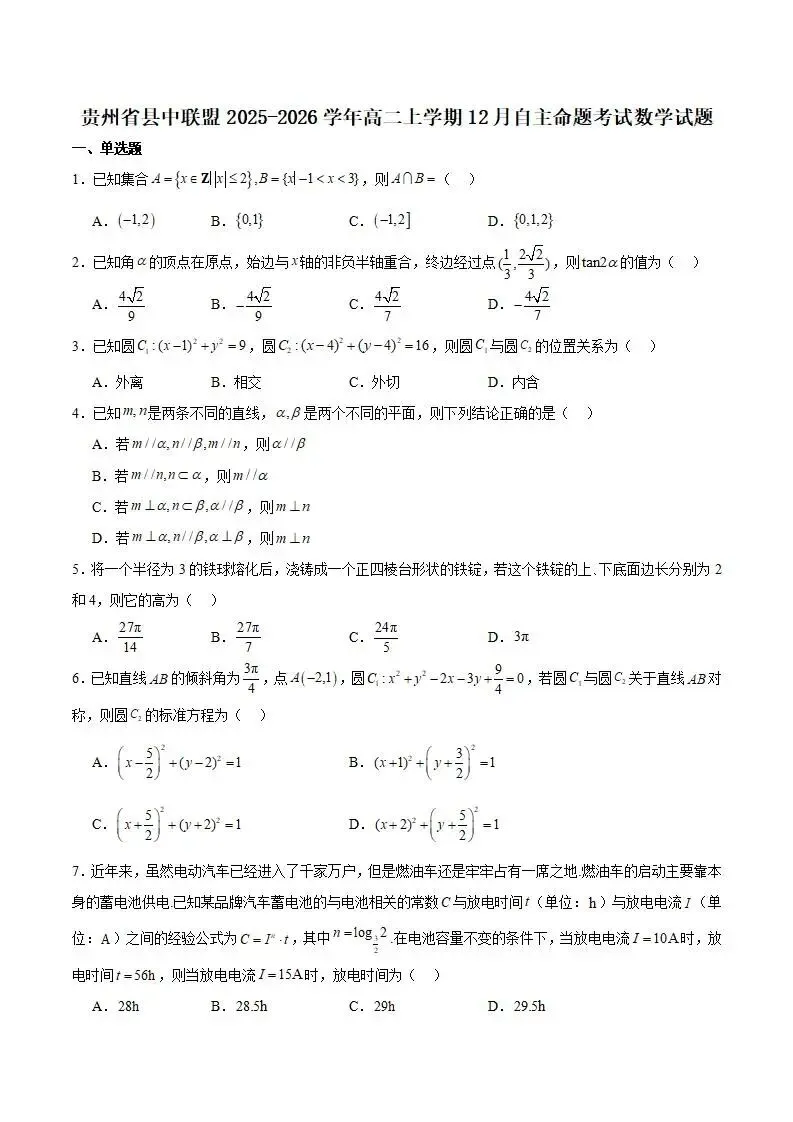 >《高中试卷》贵州省县中联盟2025-2026学年高二上学期十二月自主命题考试数学(含答案)