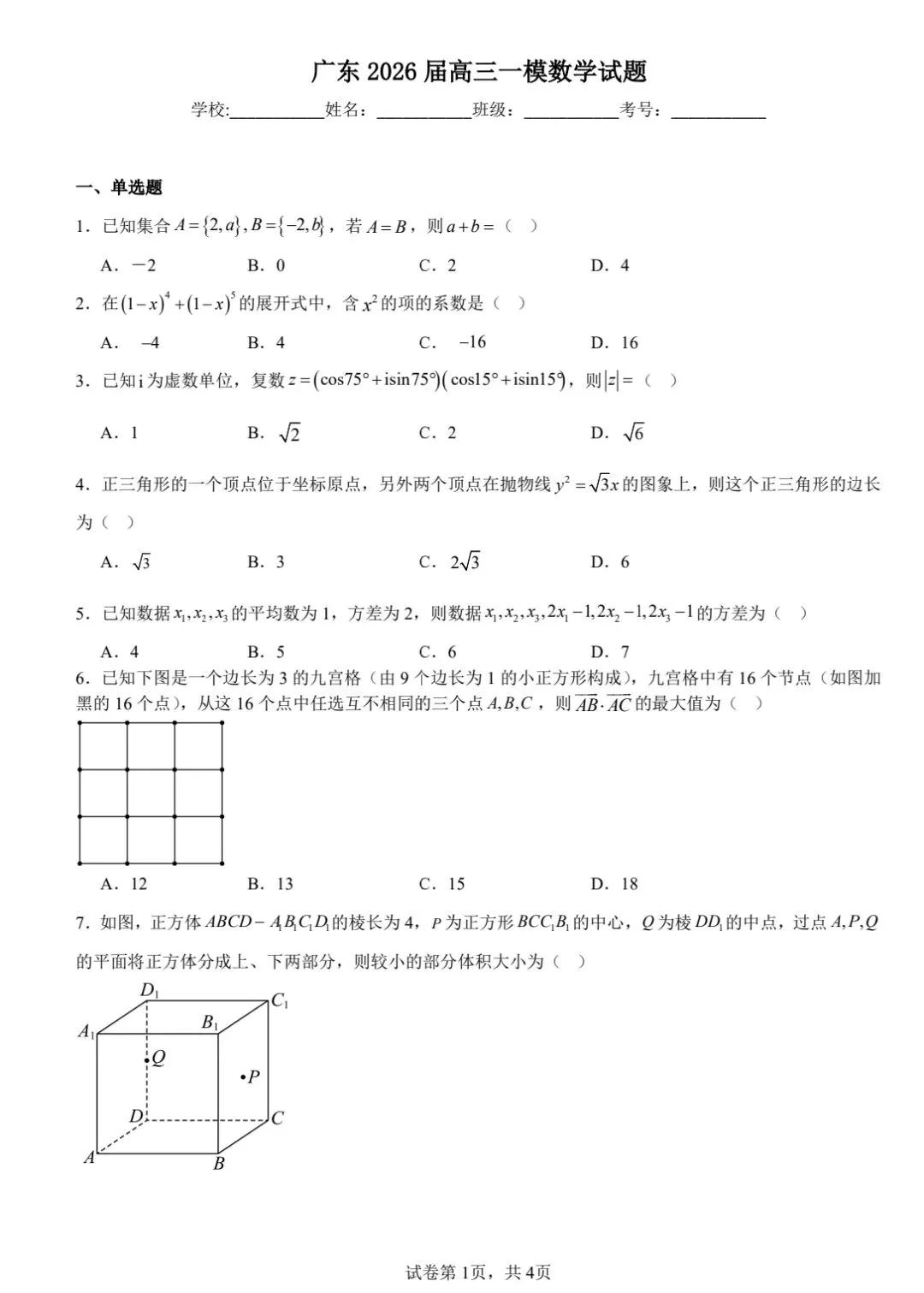 《高中试卷》贵州省六盘水市2026届高三上学期2月适应性考试数学(含答案)