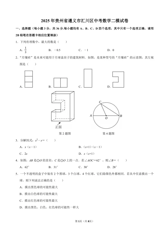 2025年遵义市汇川区中考数学二模试卷,既是对学生知识掌握情况的全面检测,也是对中考方向的一次精准预演。试卷难度适中,注重基础,突出思维,体现了“减负提质”的教学导向。