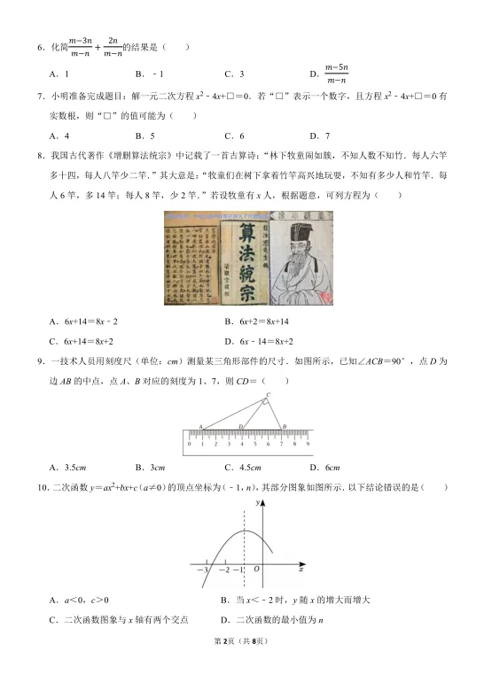 数与代数有理数比较、因式分解、分式化简、一元二次方程根的判别方程组选取与求解(第17题)一次方程建模(第8题古算诗)