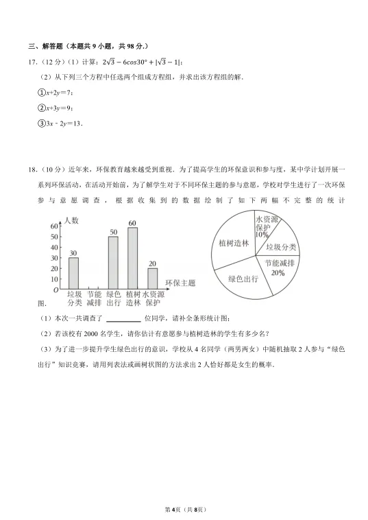 统计与概率条形统计图补全、样本估计总体(第18题)列表法或树状图求概率(第18题)
