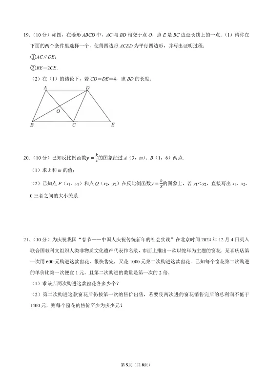 函数与图象反比例函数(第20题)二次函数图象与性质(第10题)实际情境下的抛物线建模(第24题)