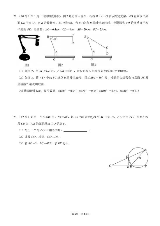 整体来看,本次试卷难度适中偏易,但在个别题目上设置了明显的思维障碍和综合应用能力考查,具有较好的区分度。基础题约占60%,如第1题有理数比较、第3题因式分解、第5题概率判断等,均为常规题型,考生应做到不失分。中档题约占30%,如第9题直角三角形中线应用、第18题统计与概率结合、第22题投影仪几何建模等,考查学生对知识的灵活运用。压轴题约占10%,如第24题抛物线型彩虹桥设计与第25题几何旋转综合题,考查建模能力、几何直观与综合推理能力。