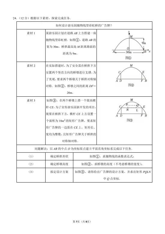 第24题:抛物线型彩虹桥 这是一道典型的函数建模与应用题,考查学生从实际问题中抽象出二次函数模型的能力。题目设置了三问,层层递进:第(1)问求抛物线表达式,考查顶点式应用;第(2)问求桥墩高度,考查函数值计算;第(3)问设计广告牌,考查矩形面积与对称性结合。此类题目体现贵州中考“贴近生活、注重应用”的特点,建议考生加强函数建模训练。