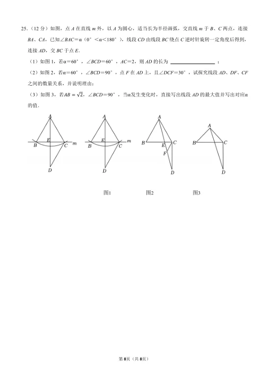 第25题:几何旋转综合题 本题为几何压轴题,涉及旋转、全等、勾股定理、线段最值等问题:第(1)问求线段长度,考查旋转后图形性质;第(2)问探究数量关系,考查几何推理能力;第(3)问求最值,考查动态几何与代数结合的思维。此类题目要求学生具备较强的几何直观和逻辑推理能力,是冲刺高分的关键。