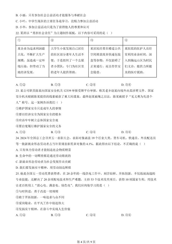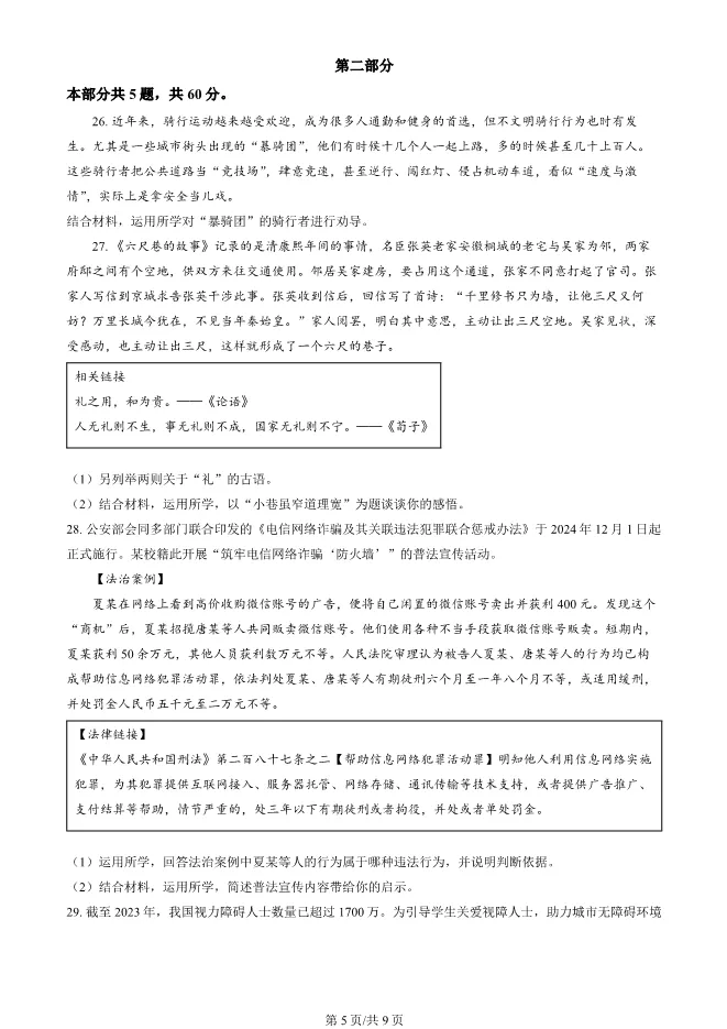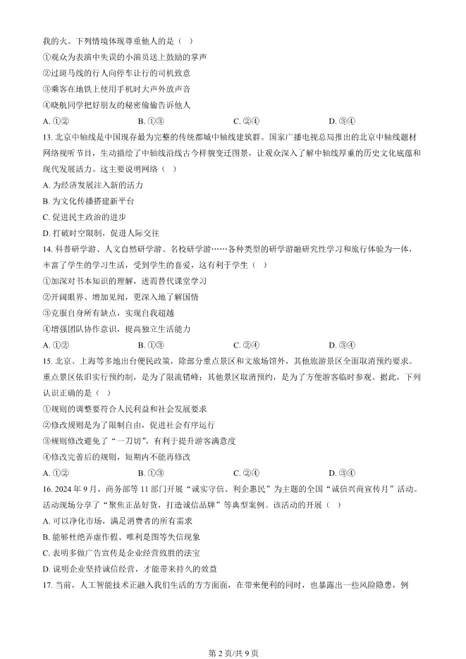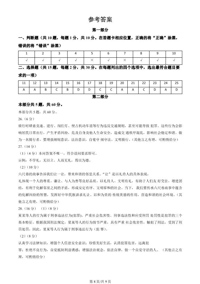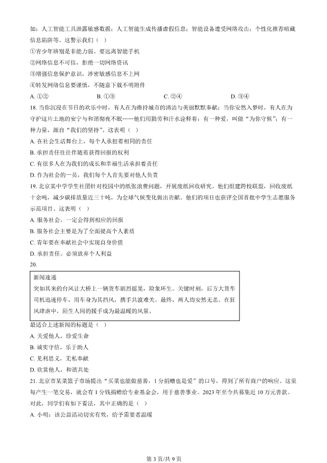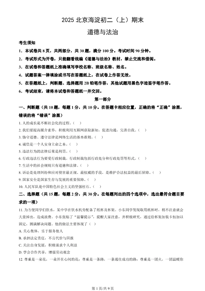 2025北京海淀初二上册期末道德与法治试卷(有答案) 电子版试卷获取,后台回复:试卷