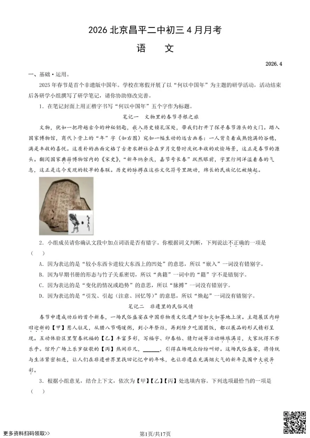 今天给大家分享的是2026北京昌平二中初三4月月考语文试卷(含答案),其他区域或学校的学生都可以练一练。近期会持续分享,欢迎大家多多关注,也可以把我们分享给更多人哦。
