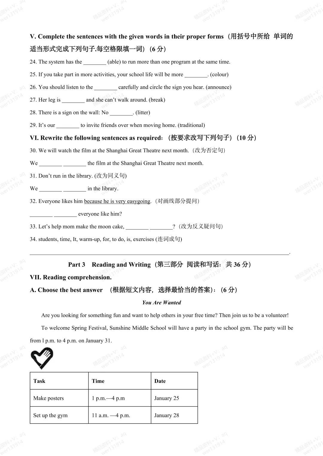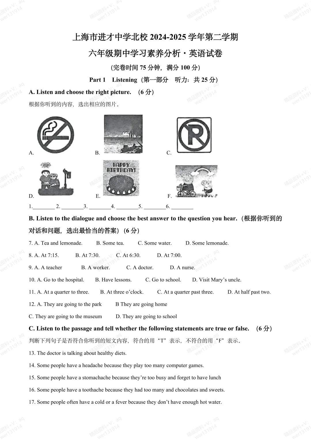 >进才北校,六年级下学期英语期中试卷(含答案&解析)!