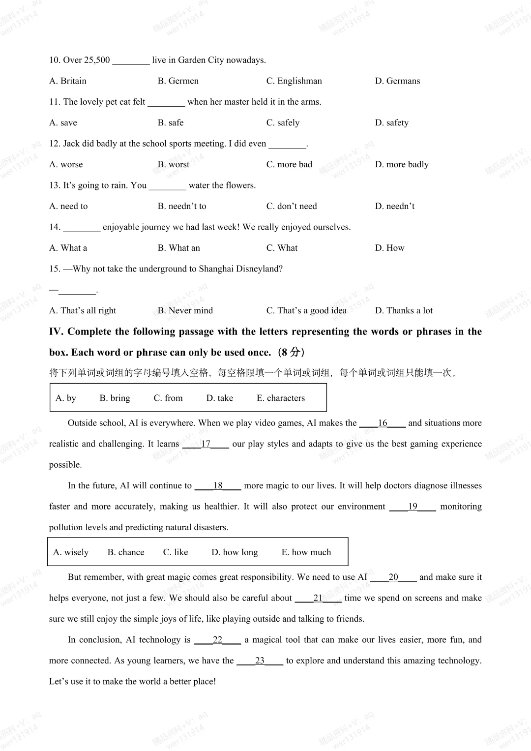 进才北校,六年级下学期英语期中试卷(含答案&解析)!