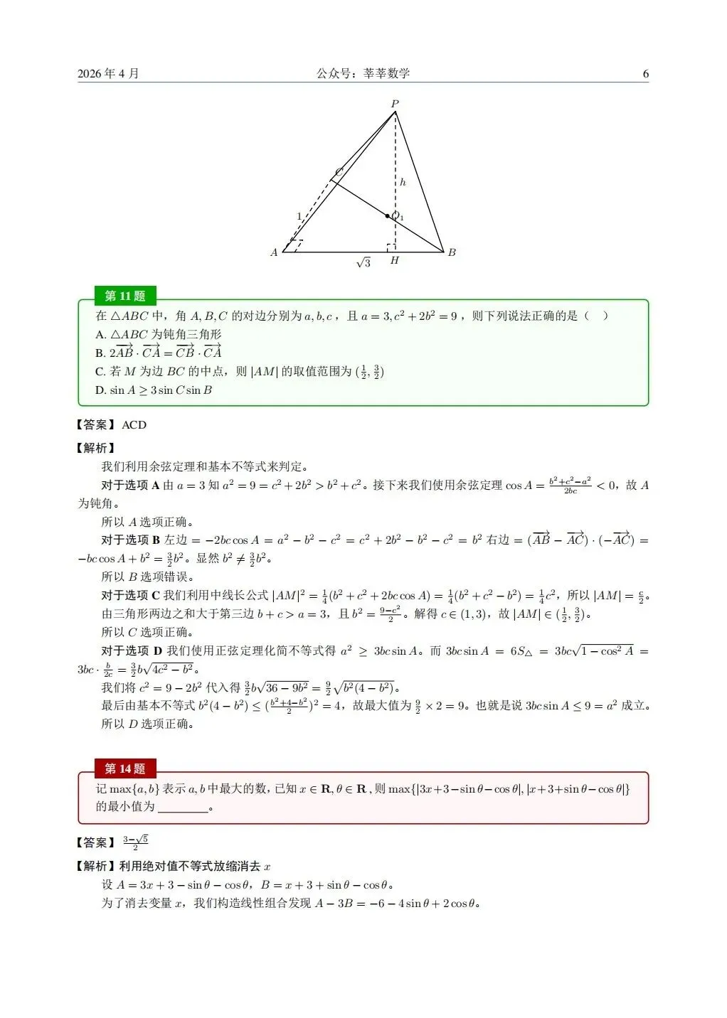 第十一题用一用余弦定理和基本不等式。而第十四题这种处理技巧是老方法了,利用绝对值不等式把x消去。试题内容如下