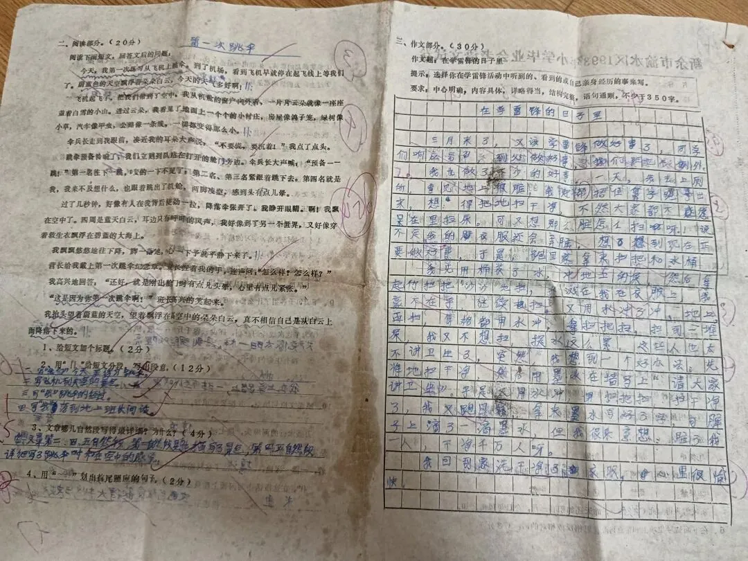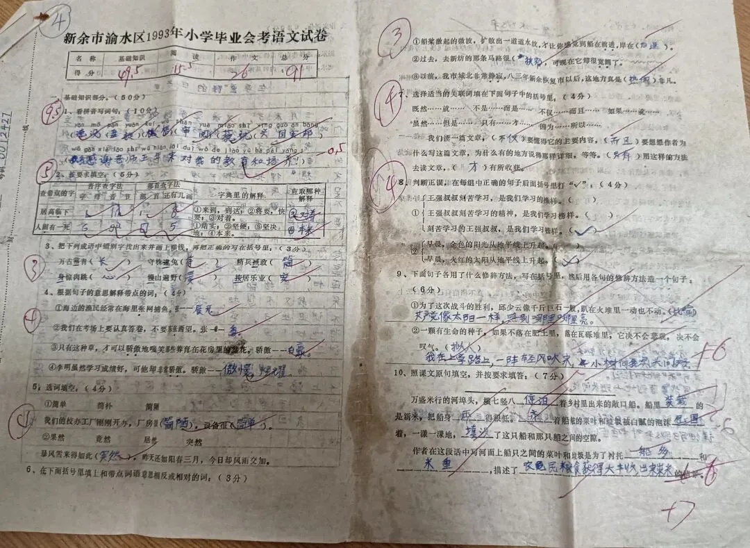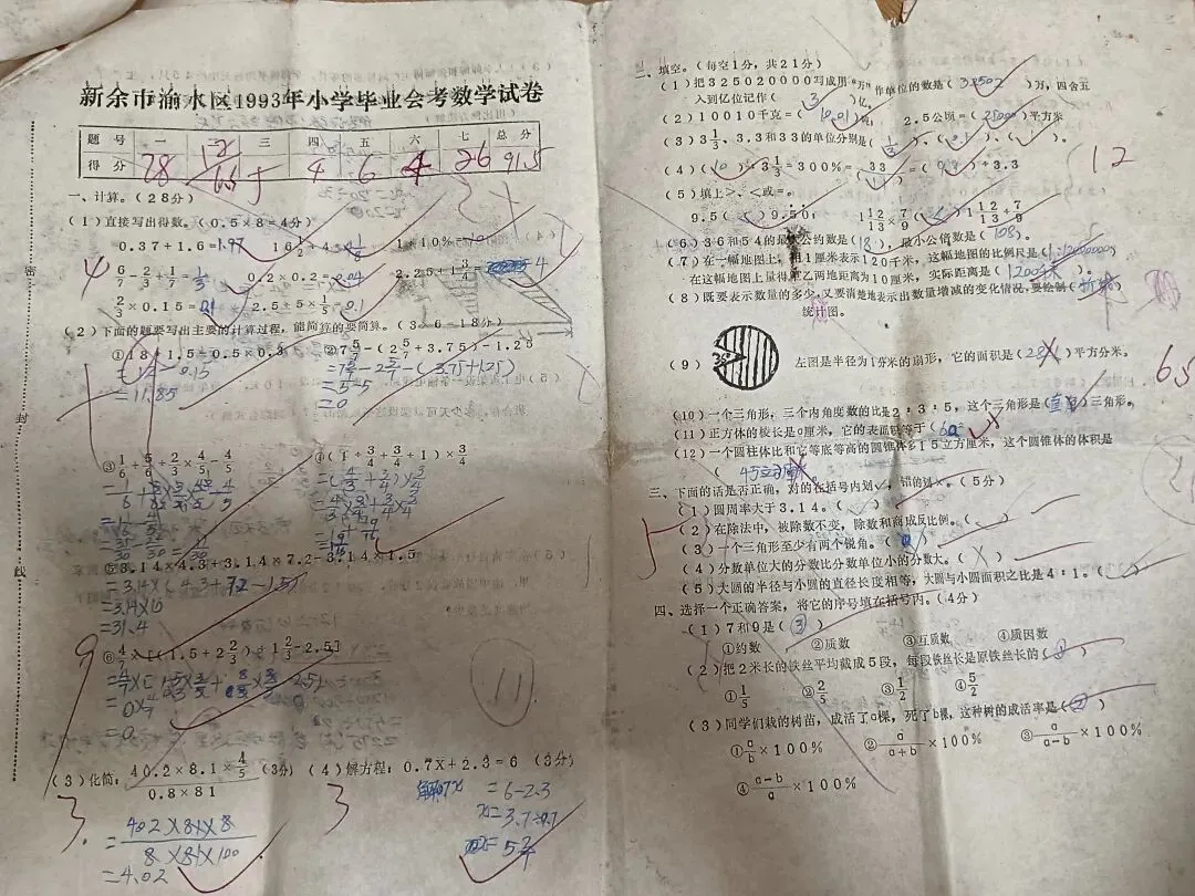 老公老家那间旧屋就像个百宝箱,每回回去,都翻箱倒柜,像是在时光里寻宝。这次竟翻出他泛黄发脆的小学毕业会考试卷,油墨淡去,字迹稚嫩,满是九十年代的烟火气。