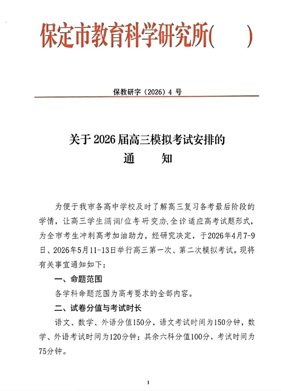 最新试卷+答案!4.7保定一模保定市2026届高三第一次模拟