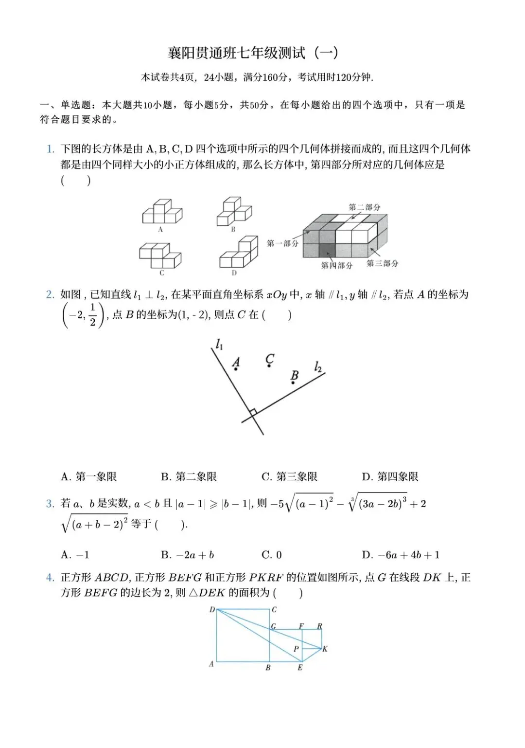>最新 襄阳贯通考试数学试卷(一) 七年级真题