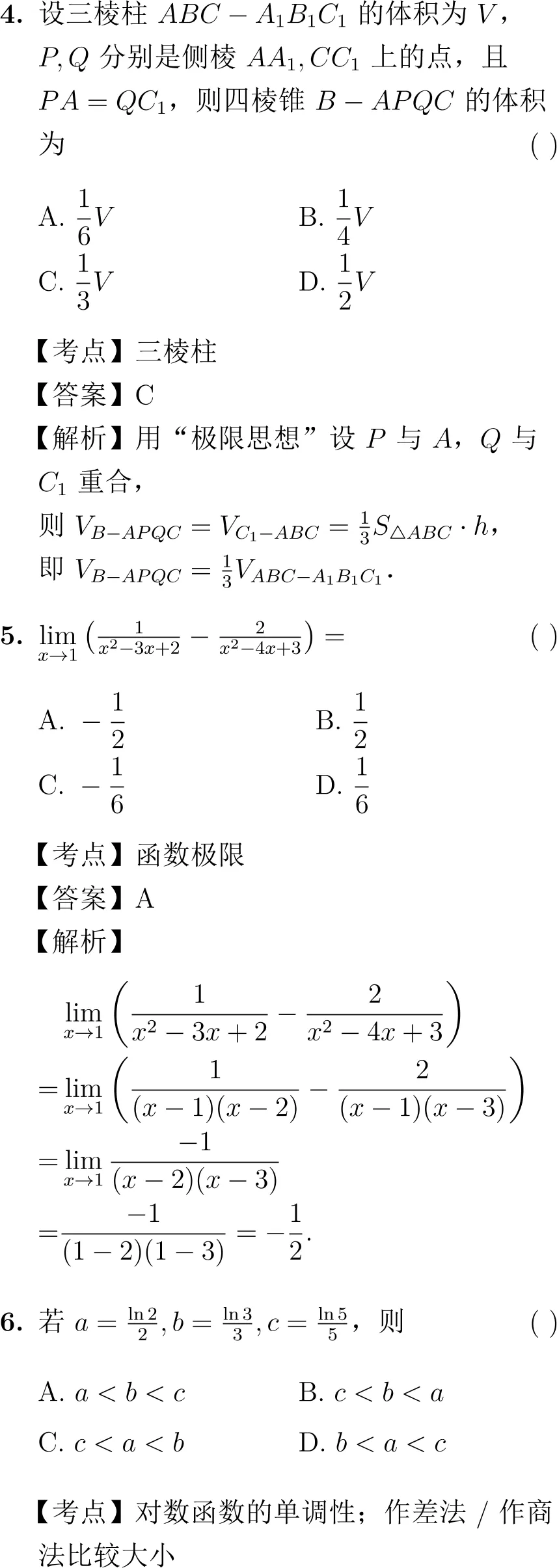 立体几何:第4题以三棱柱为载体,用极限思想求体积,第18题考查面面垂直性质、线面垂直判定与二面角求解,兼顾几何法与空间向量法,体现对空间想象能力的考查。