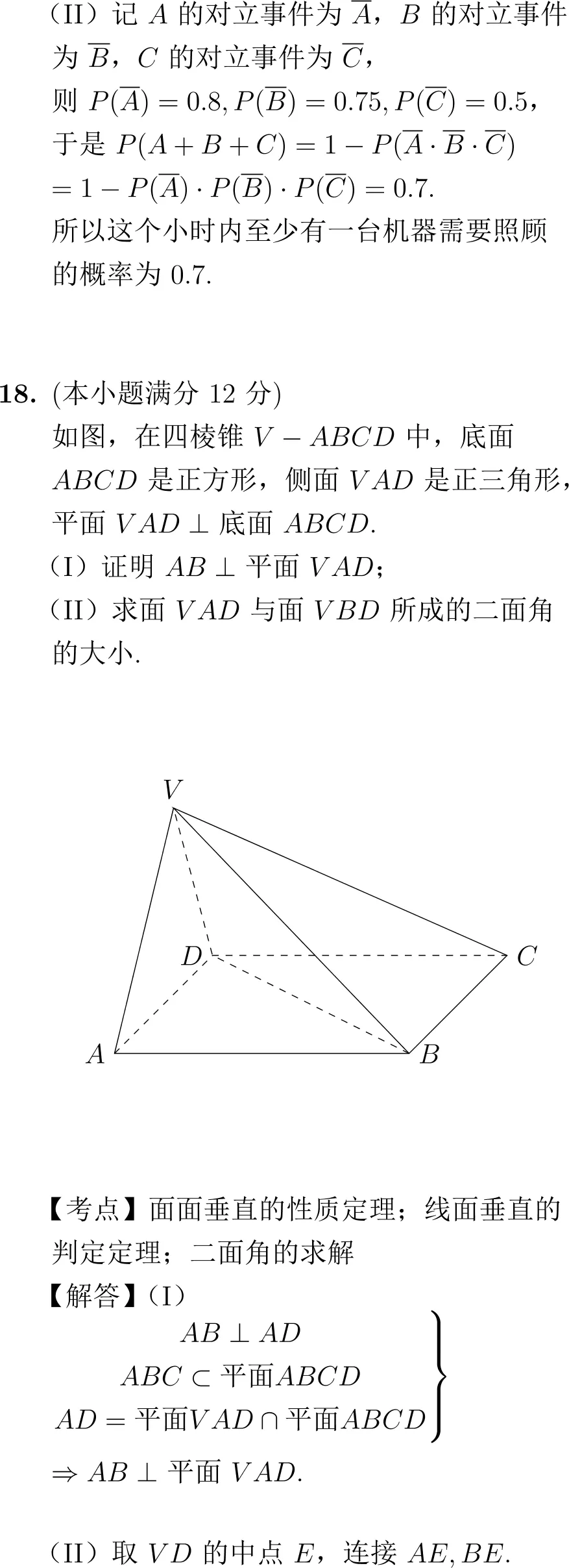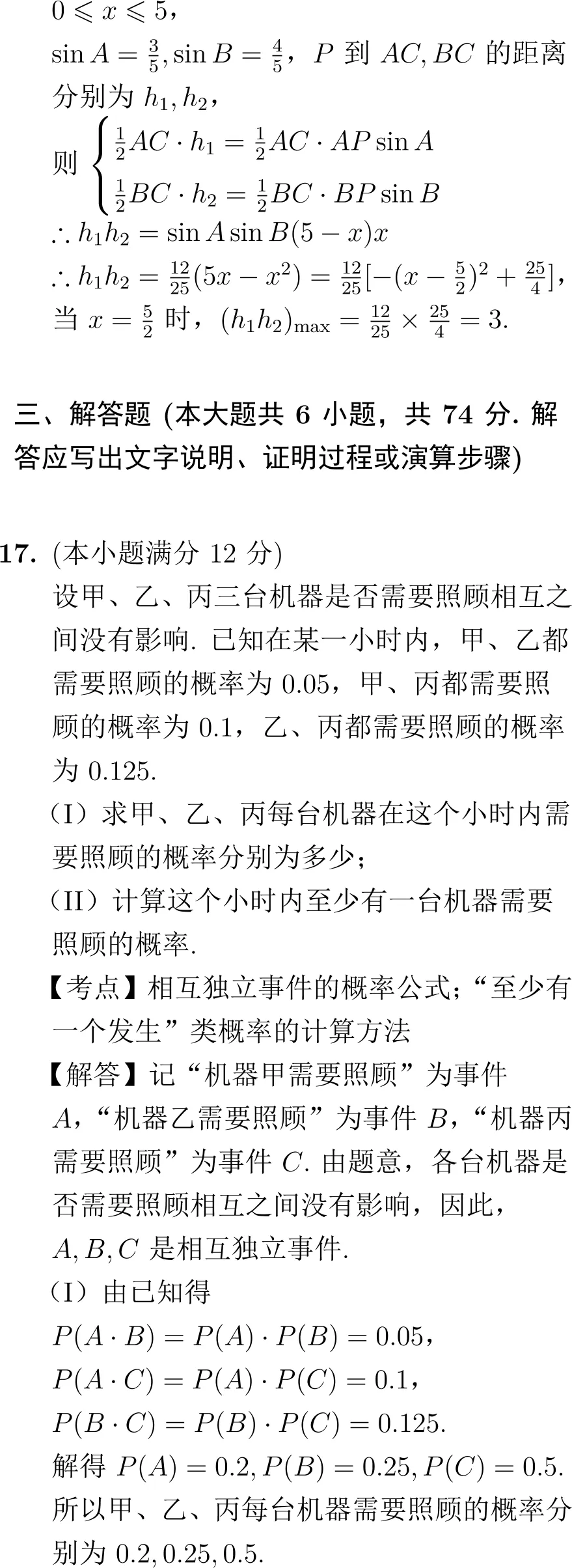 概率统计:第17题以三台机器的独立事件为背景,考查独立事件概率公式与“至少一个发生”的对立事件法,是概率应用的典型题型。