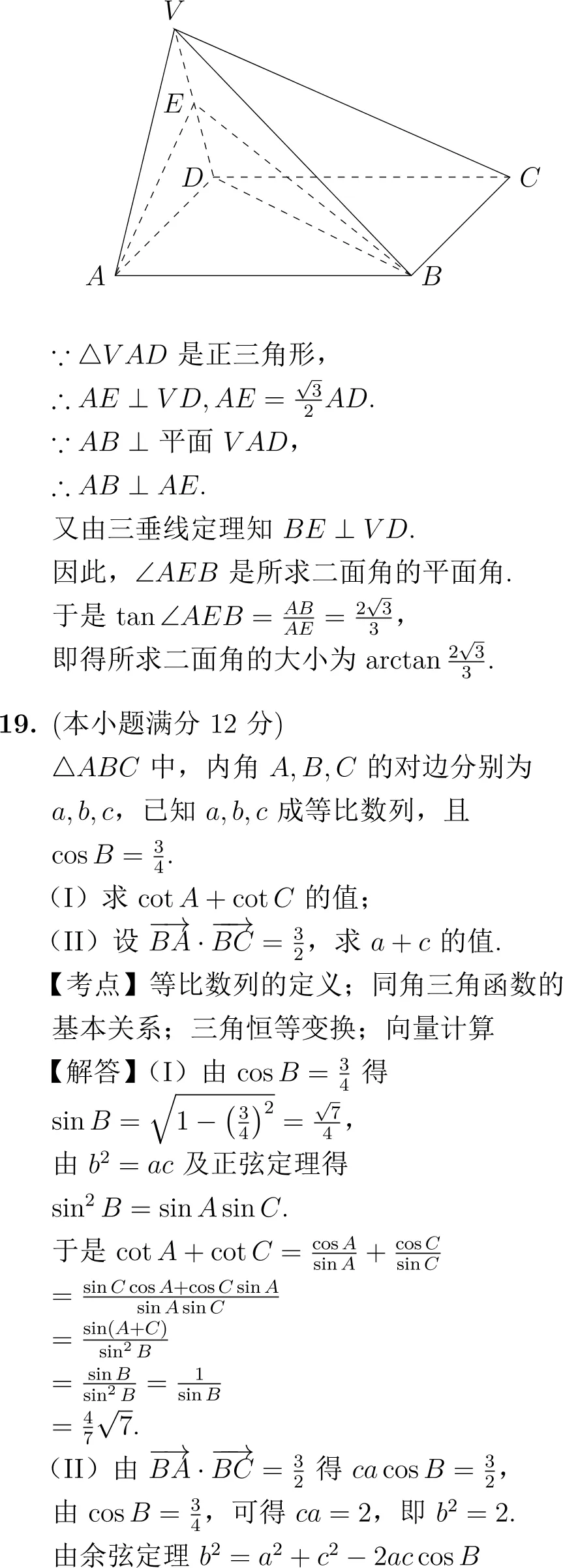 三角函数:第1、7、8题考查象限角、同角关系、二倍角公式,第19题结合等比数列、向量数量积,综合考查三角恒等变换与正余弦定理,突出通法应用。