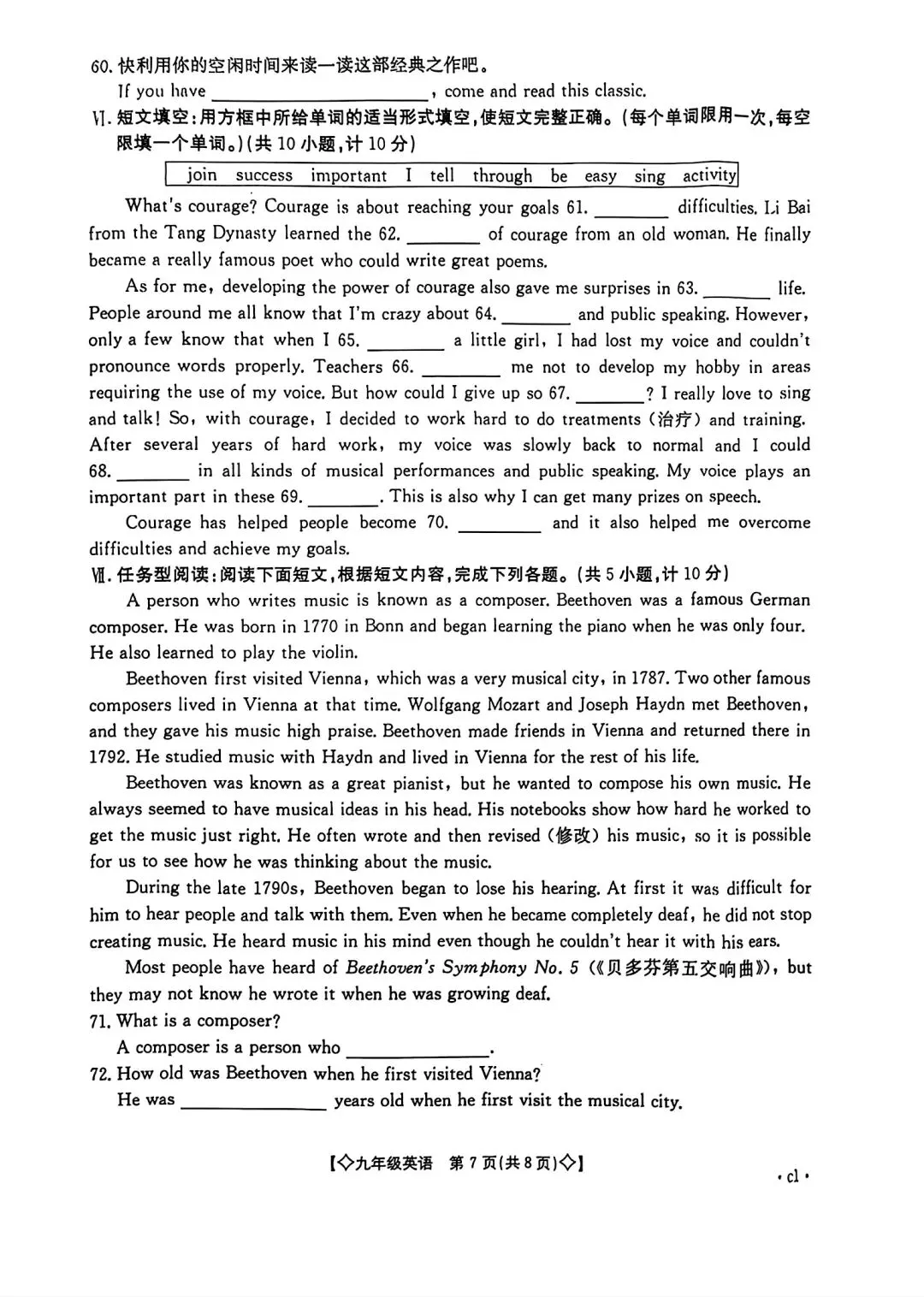 七下语文期中考试卷(有答案)️