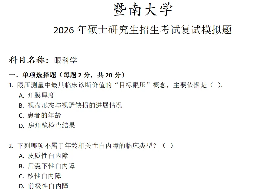 当前位置:首页>考研真题>暨南大学眼科学考研复试真题模拟