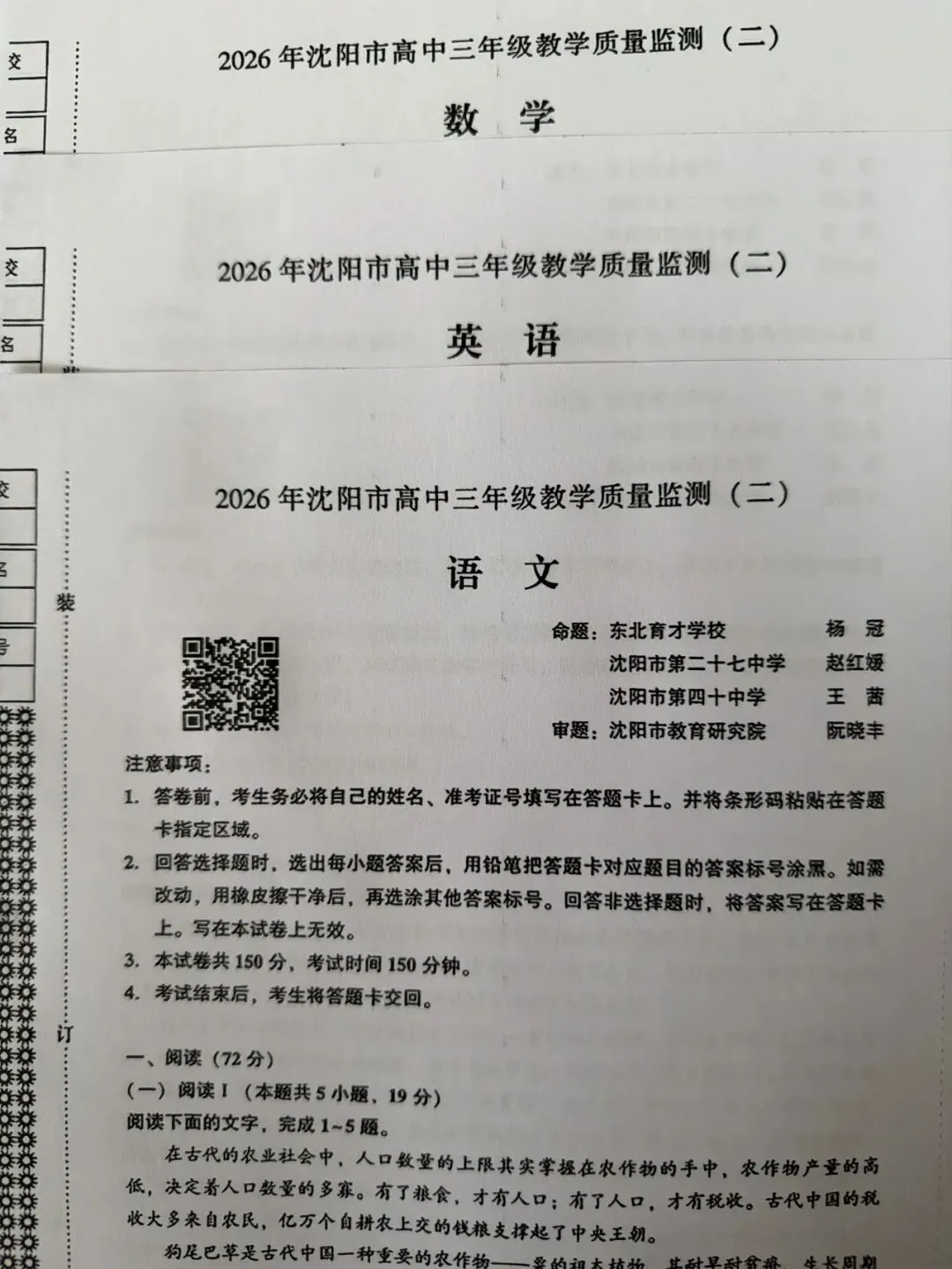 >【试卷+答案】沈阳二模2026年沈阳市高中三年级教学质量监测(二)全科汇总!