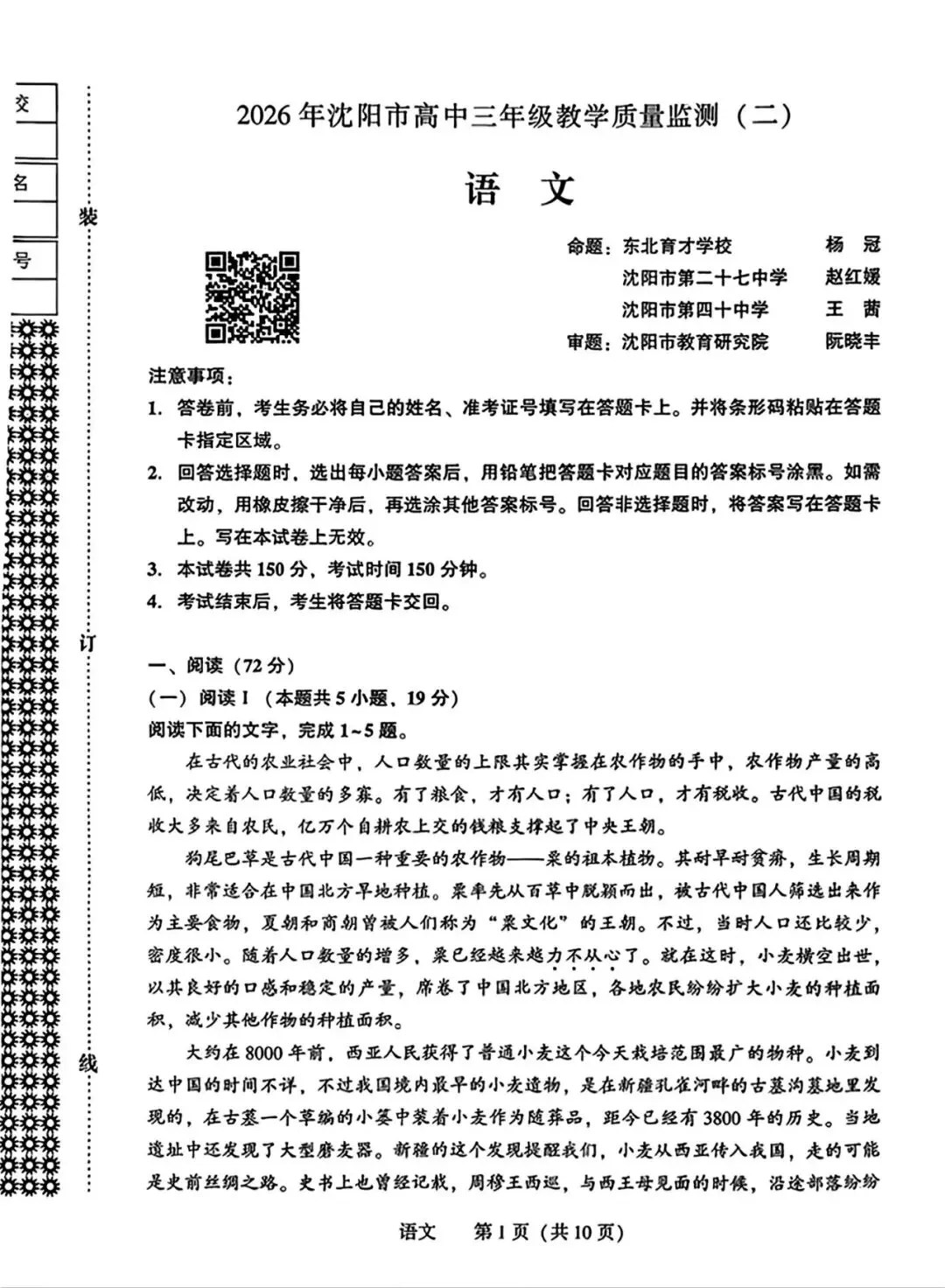 【试卷+答案】沈阳二模2026年沈阳市高中三年级教学质量监测(二)全科汇总!