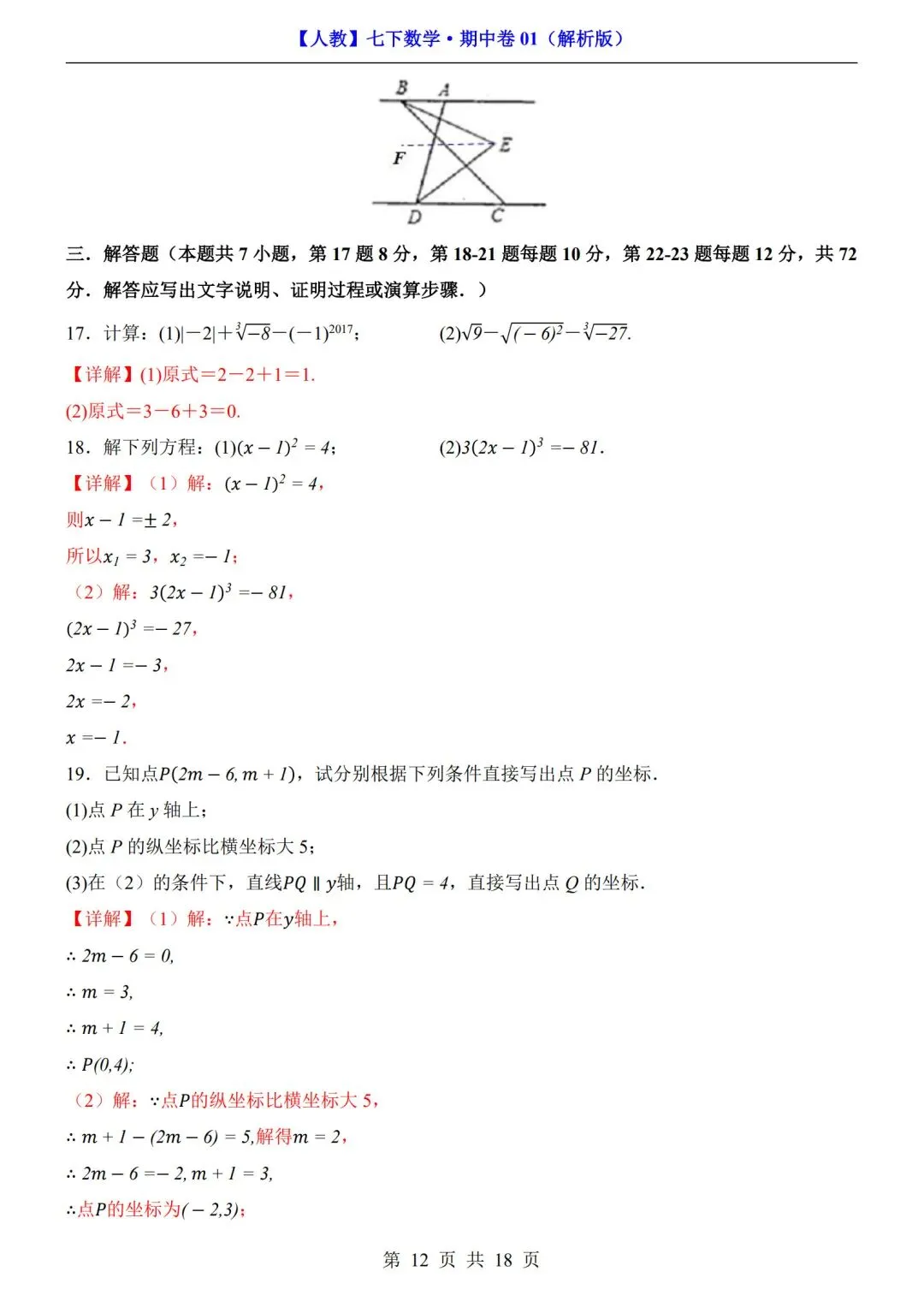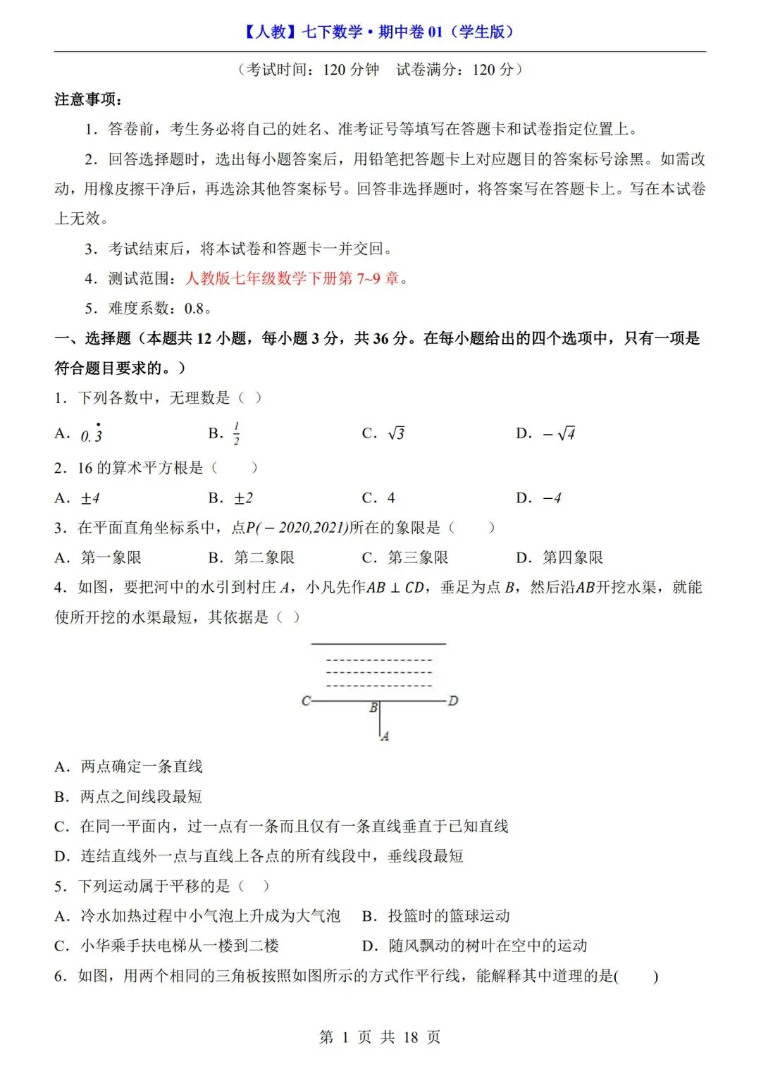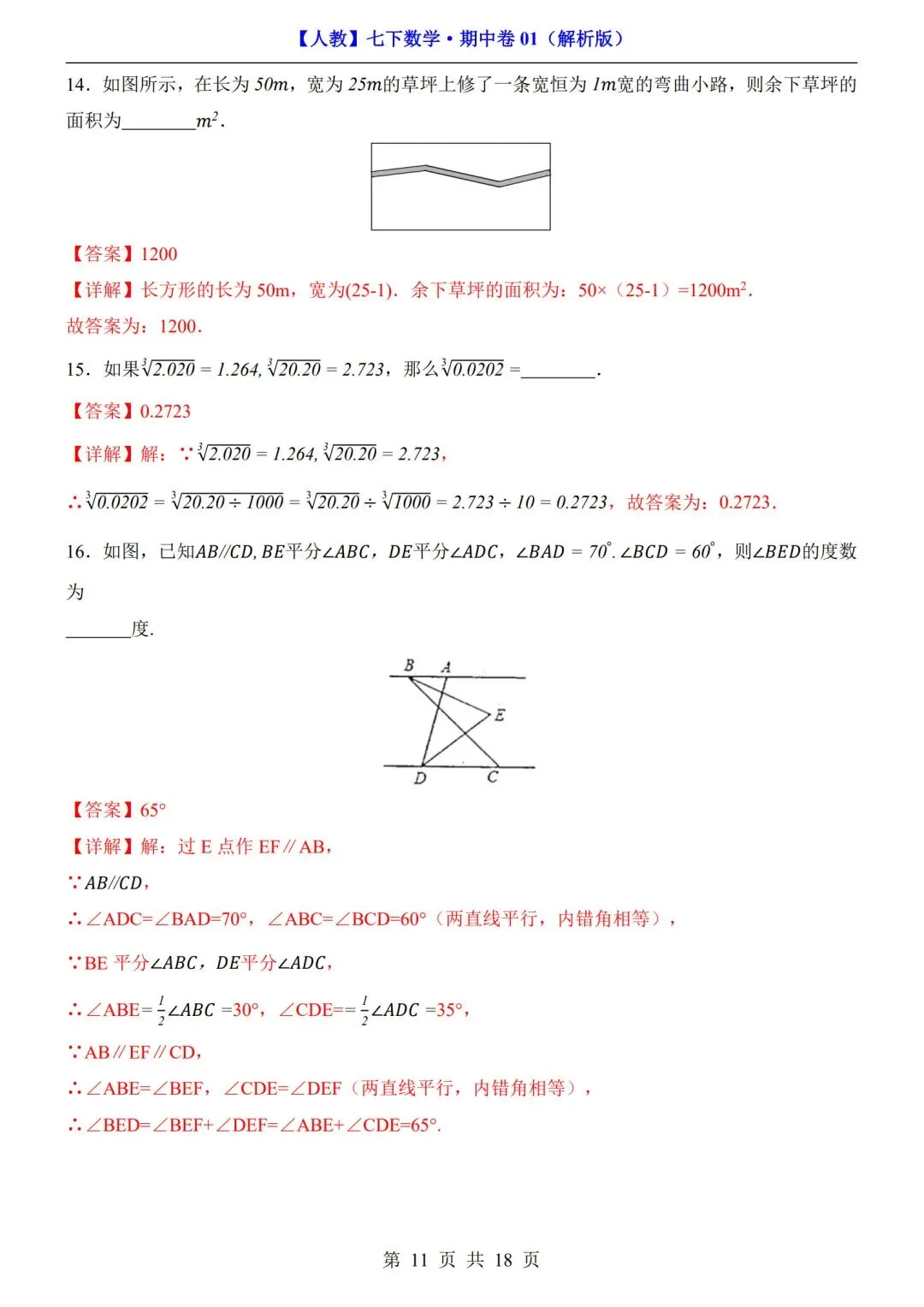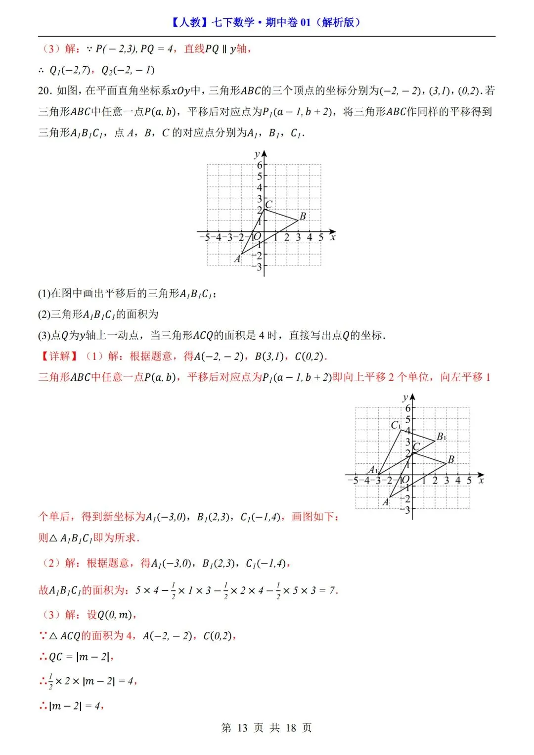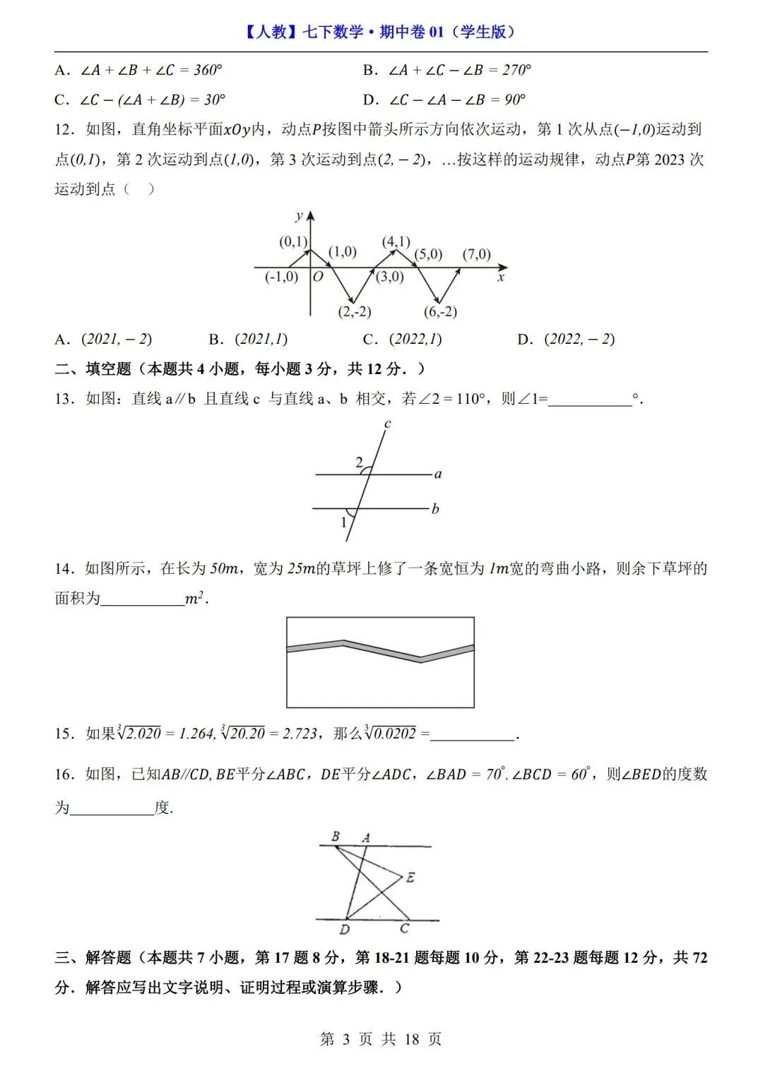 >数学人教版-七年级下册期中试卷+答案|可打印
