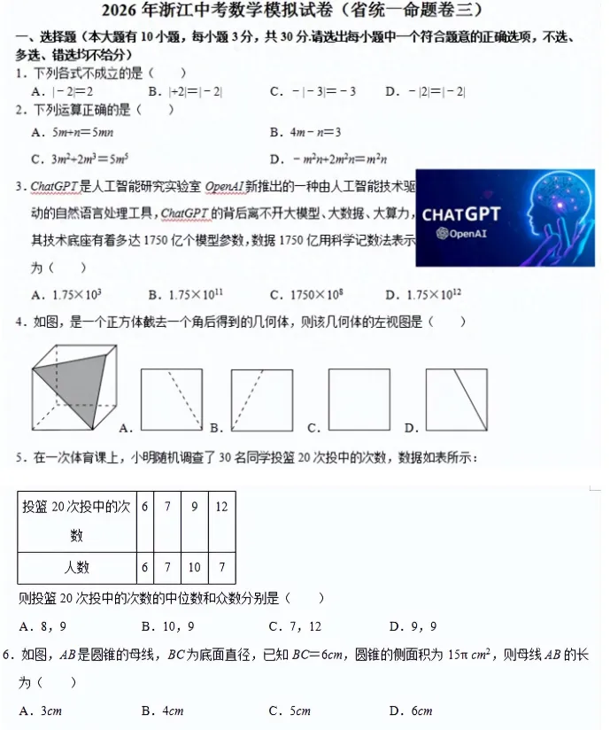 2026年浙江中考《数学》模拟试卷(省统一命题卷三).