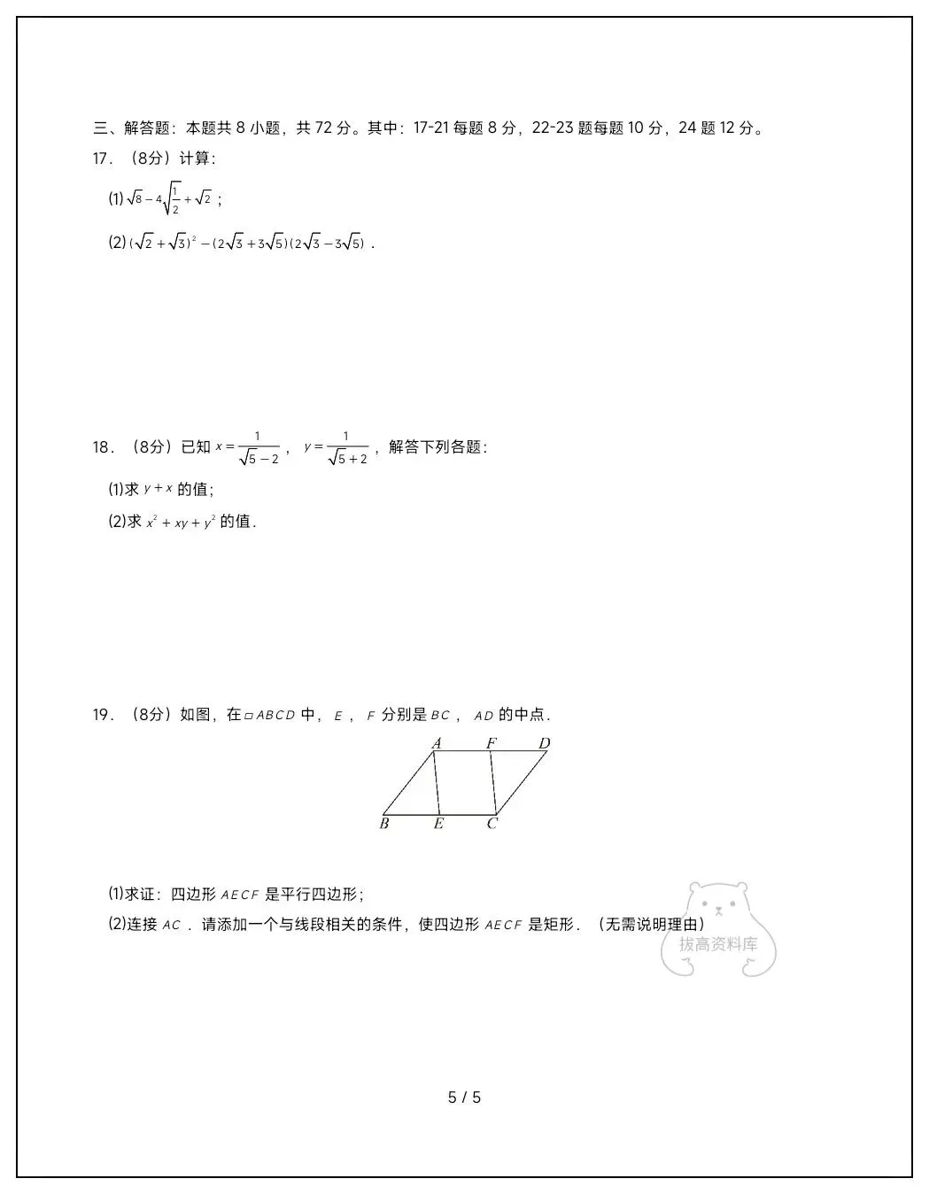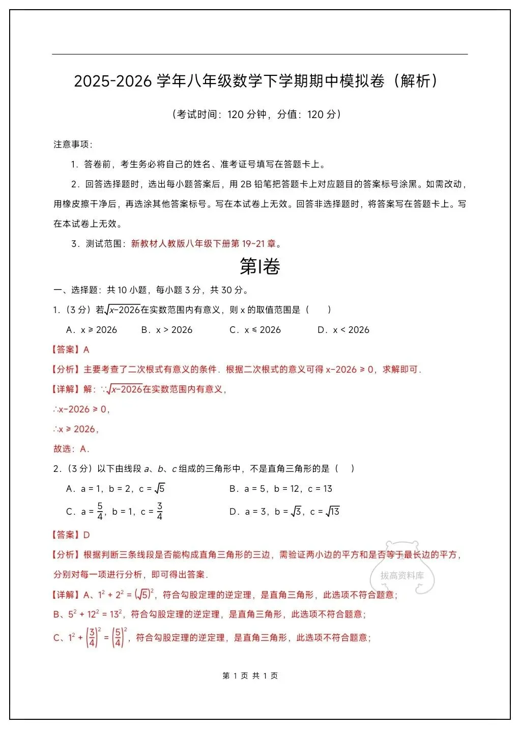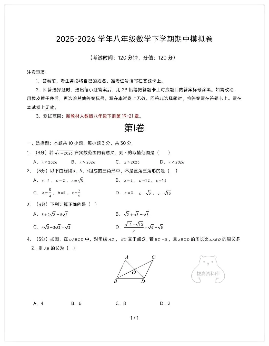 2026八年级数学下册期中模拟试卷+答案(可下载打印)