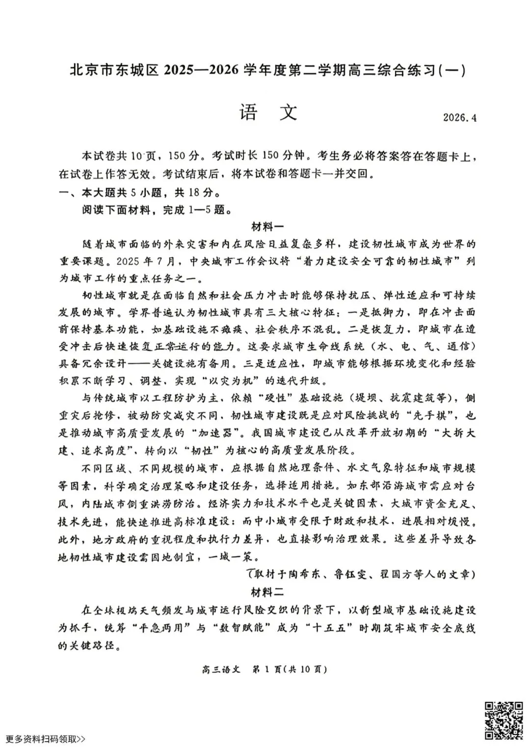 今天给大家分享的是2026北京东城高三一模语文试卷(含答案),其他区域或学校的学生都可以练一练。近期会持续分享,欢迎大家多多关注,也可以把我们分享给更多人哦。