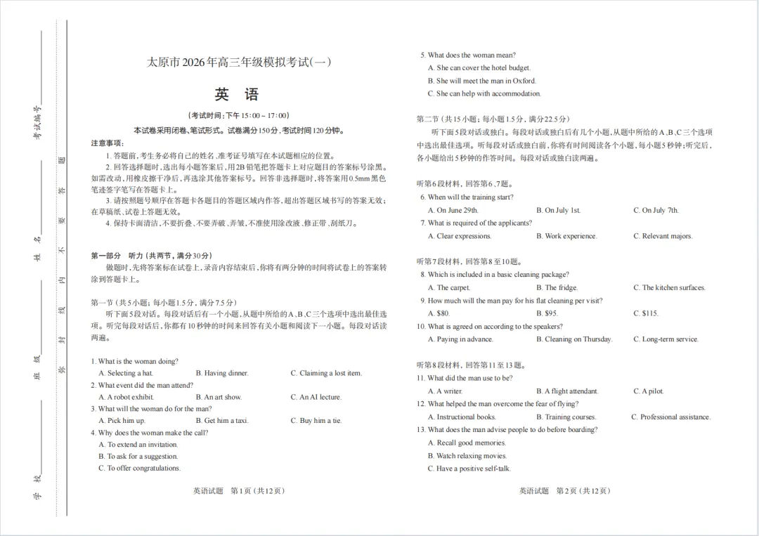 石家庄26年4月新华区中考模拟全科试卷及答案!(含英语听力)