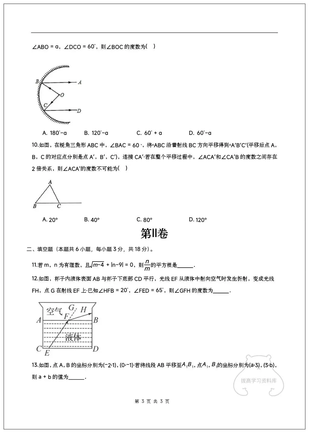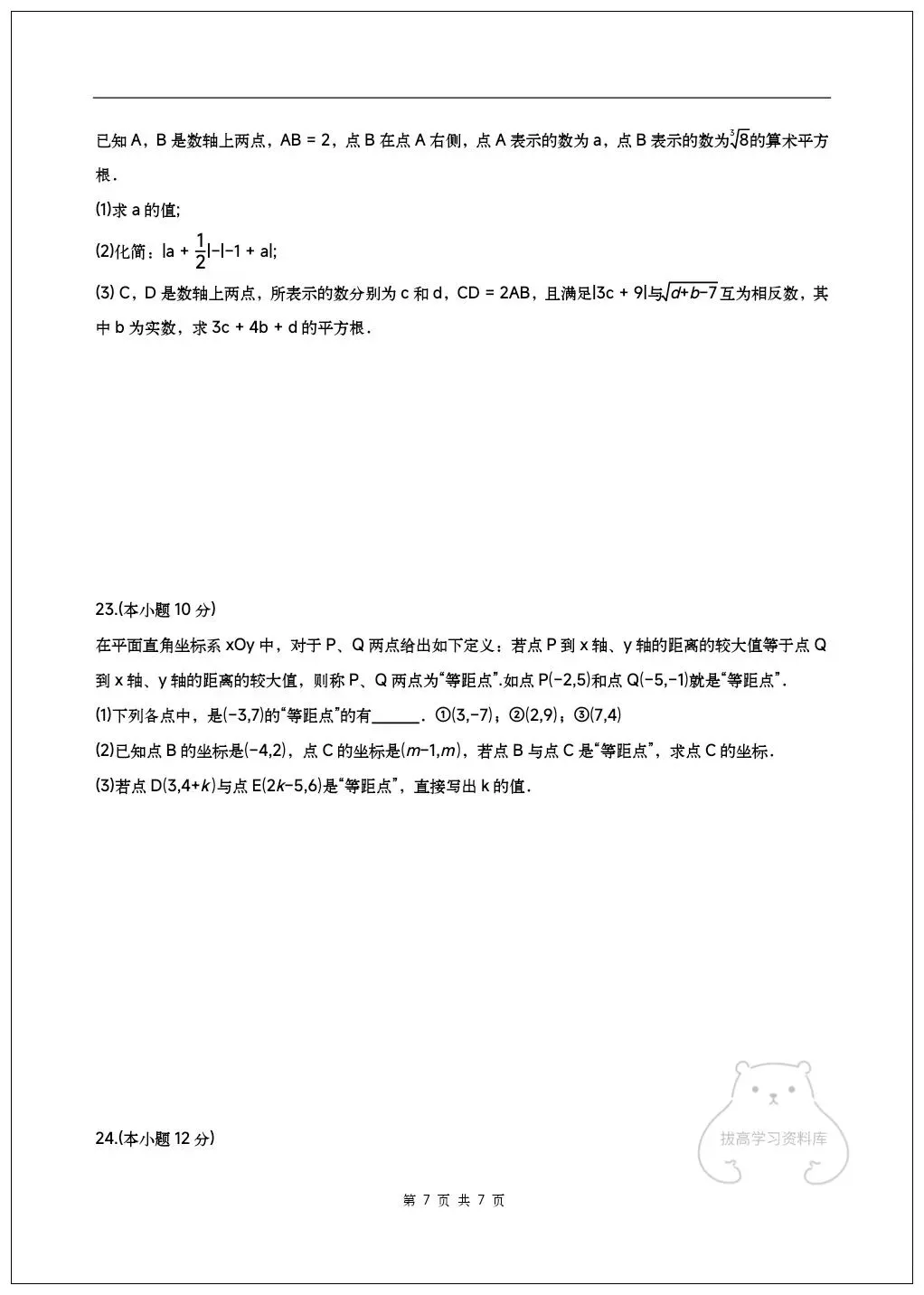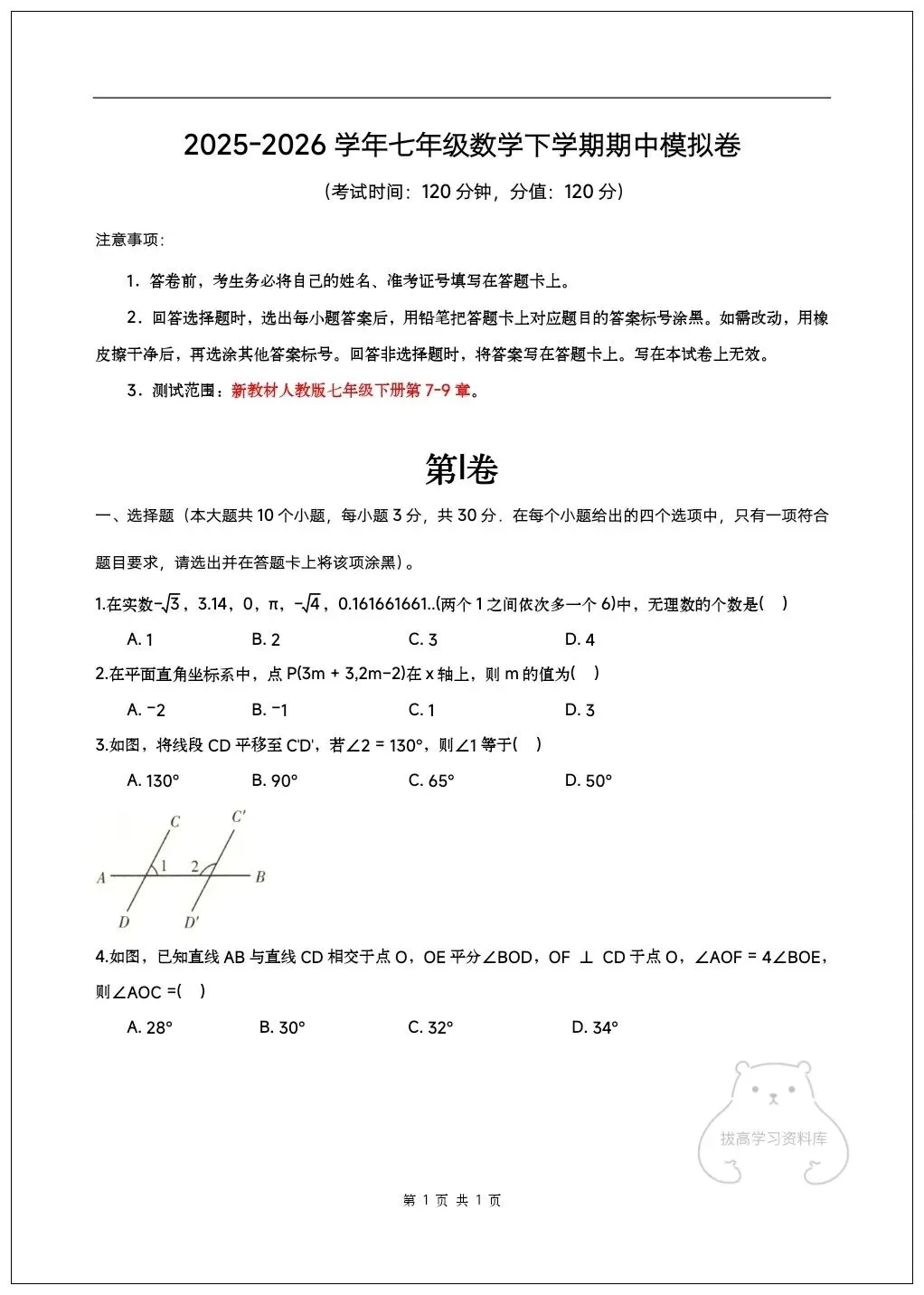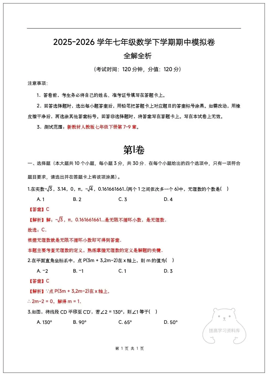 2026七年级下册数学期中试卷(附答案解析)共6套,可下载打印!