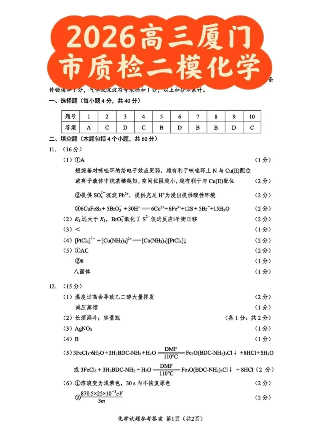 2026厦门高三二检试卷+答案【数学+物理+化学】