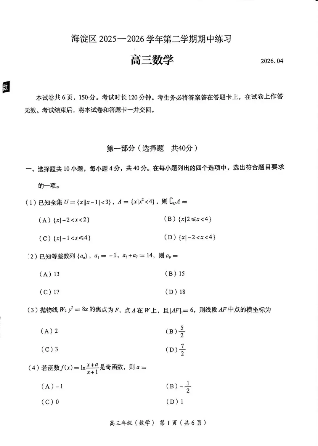 >2026年北京海淀区高三一模数学试卷