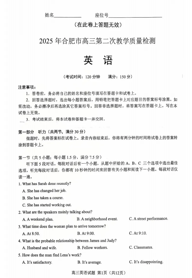 当前位置:首页>考研真题>2025年合肥高三二模检测英语试卷及答案解析