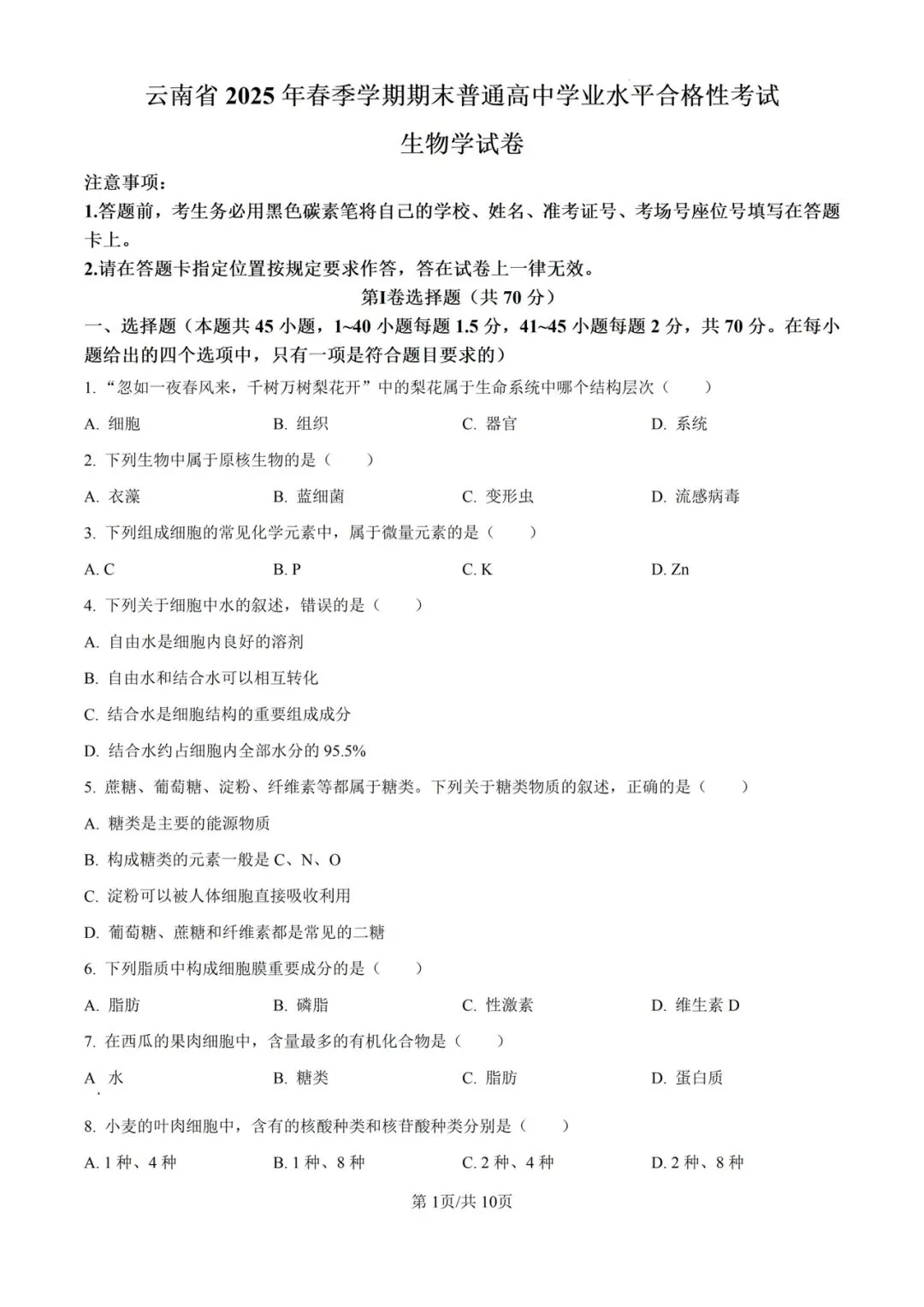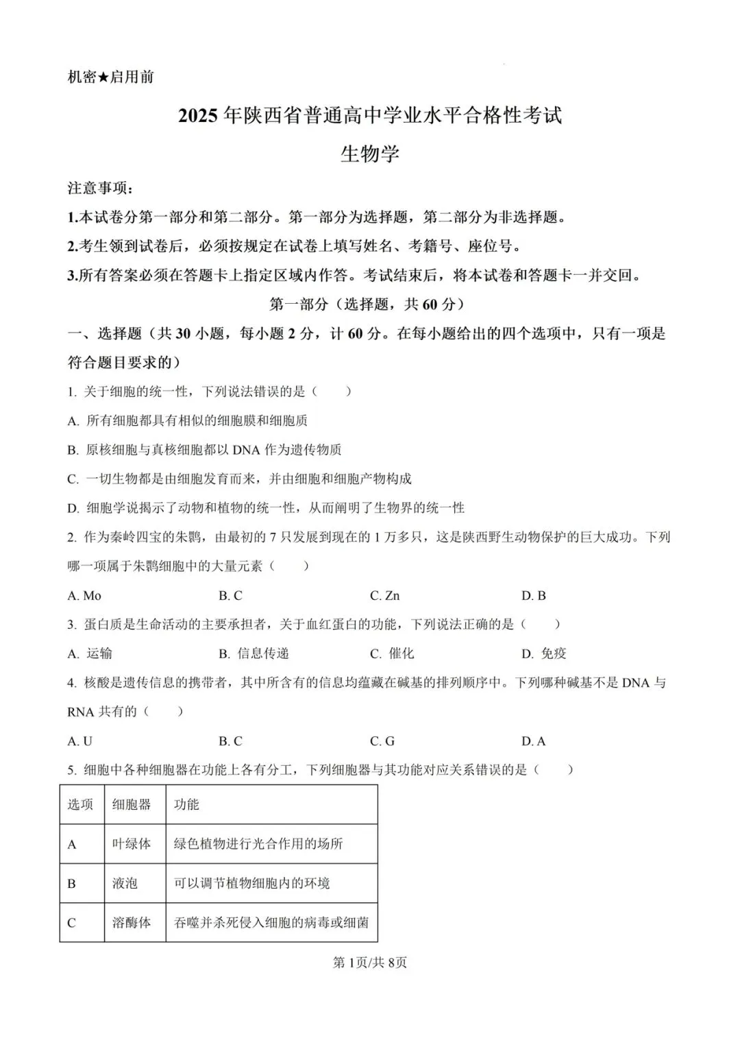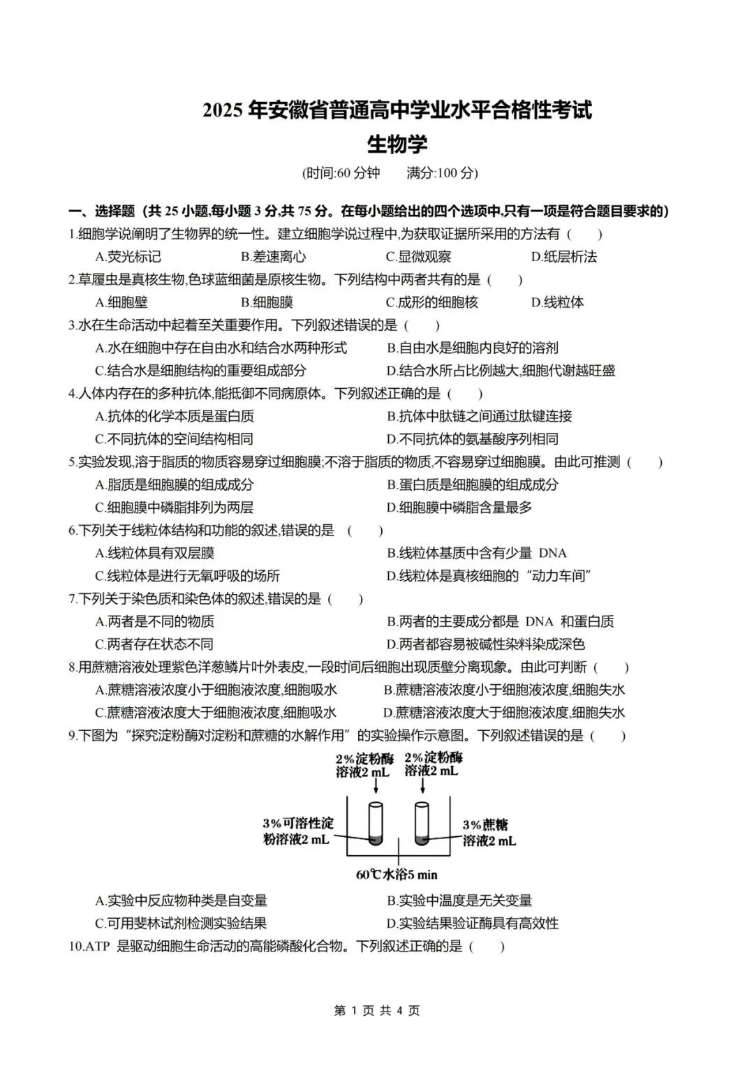 >2025年全国各省合格考(学考)生物试卷及答案
