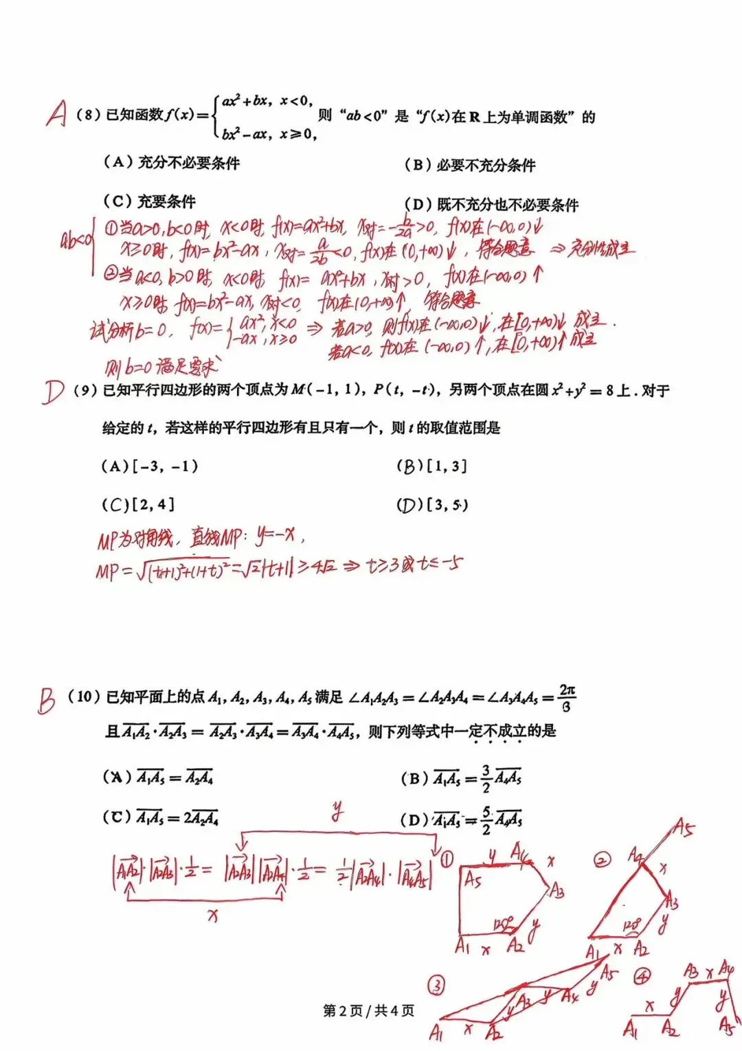 单选题8-10有难度,第8题可以用b=0进行分析,发现后条件成立范围大,小范围推大范围,得出结论。第10题向量创新题,主要考察作图分析