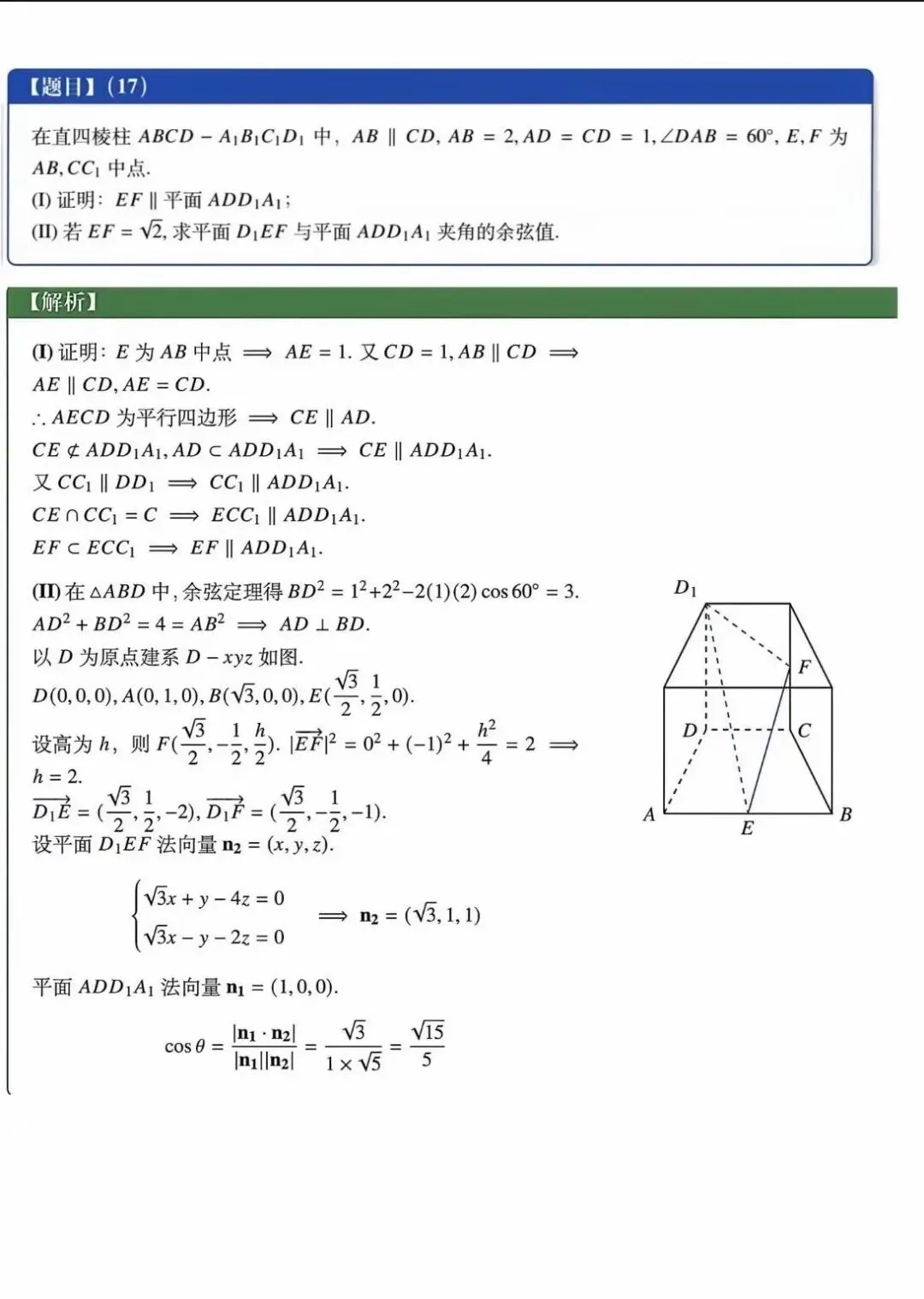立体几何题不少同学不会写,或者第二问题义理解不到位选错条件(选①)从而0分。本题建立空间直角坐标系还是很容易的