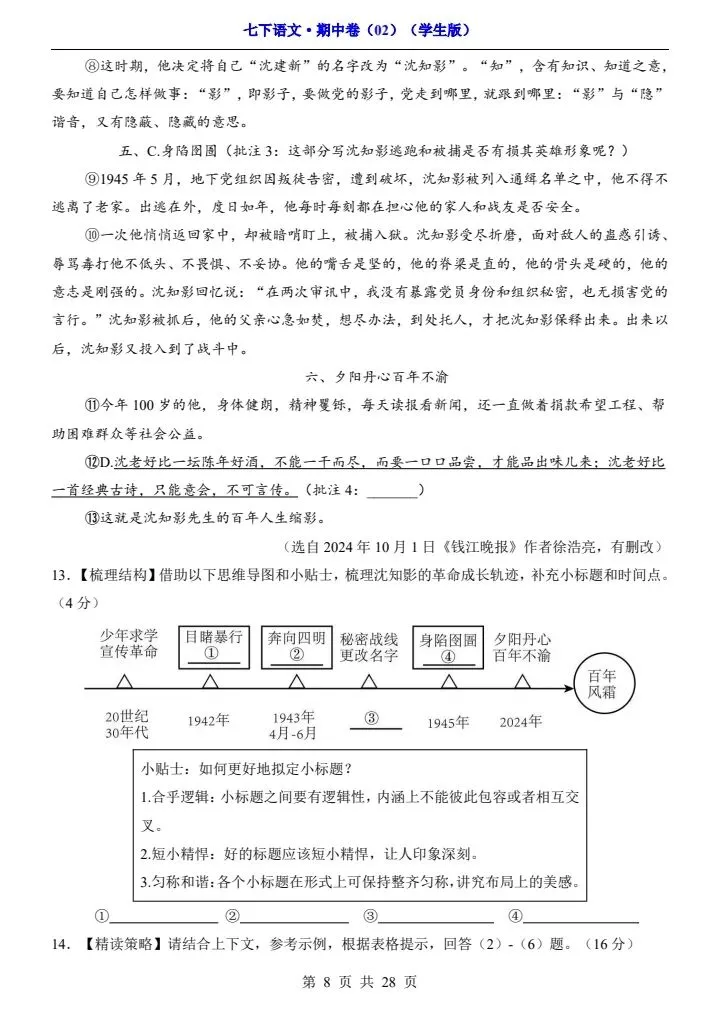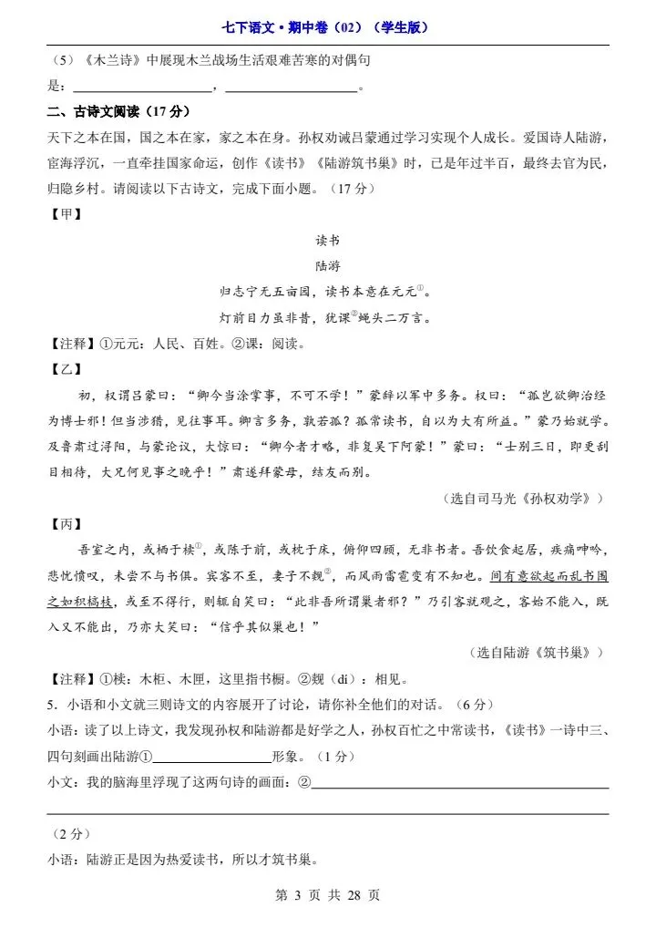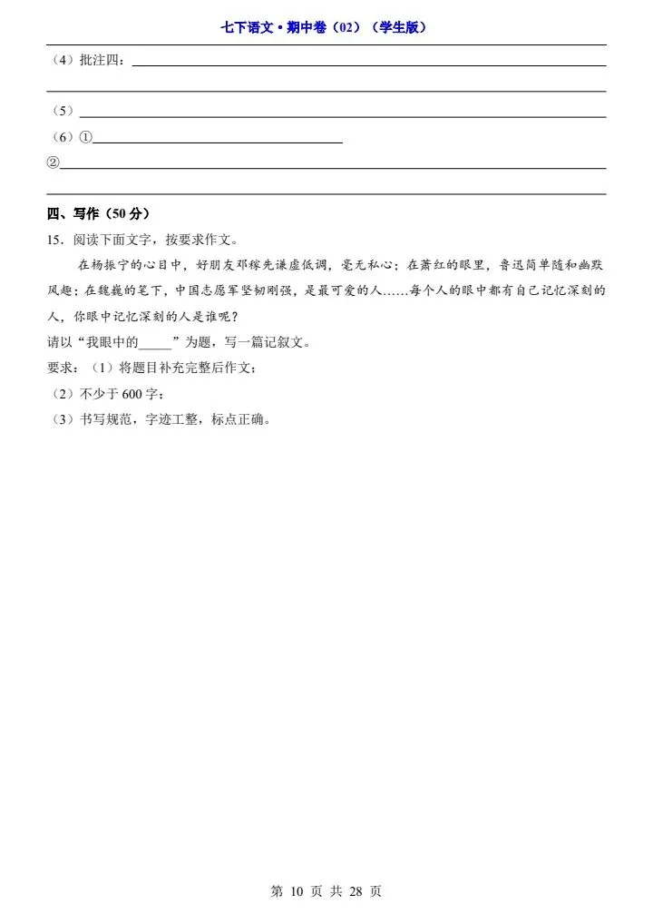 2026年春七年级下册语文《期中考试试卷》02卷,附详细解析版,完整电子版可打印!