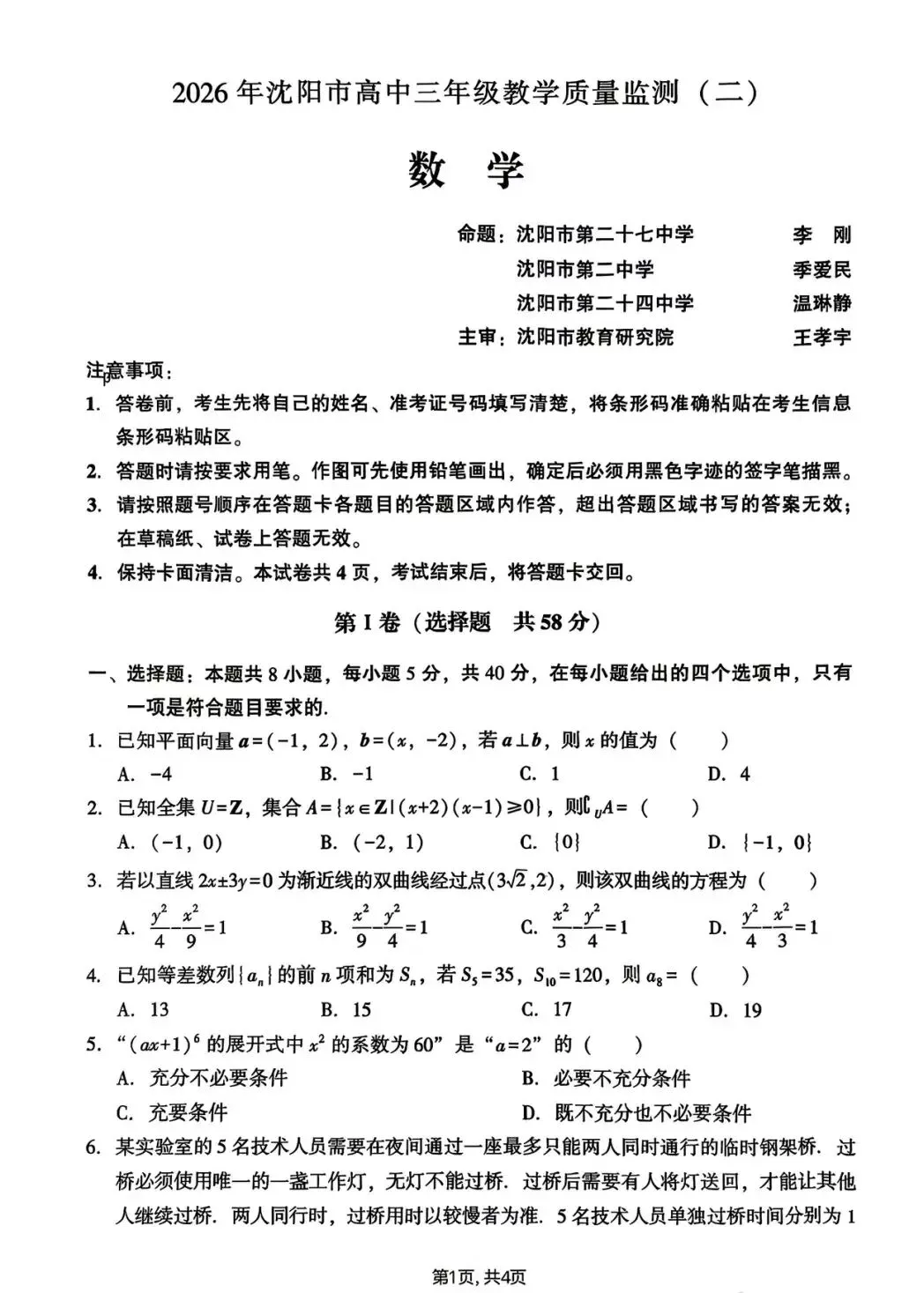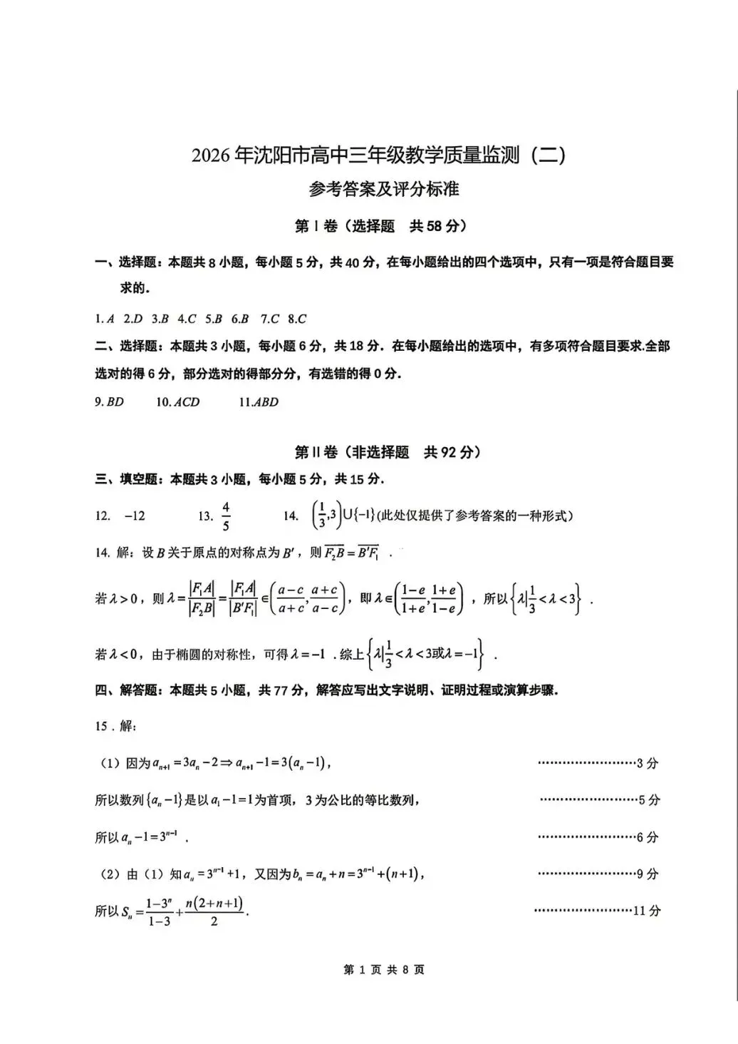 沈阳市2026.4高三二模数学试卷及答案