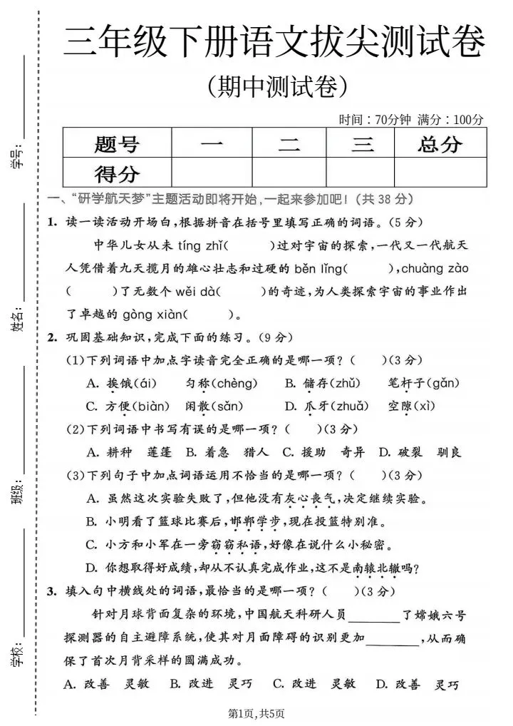 期中备考关键期!这套三年级下册语数期中测试卷,涵盖航天主题阅读、数学运算与应用等核心考点,配详细解析与解题思路,帮孩子攻克重难点、夯实基础,是家长辅导、孩子提分的必备资料,速给孩子安排!