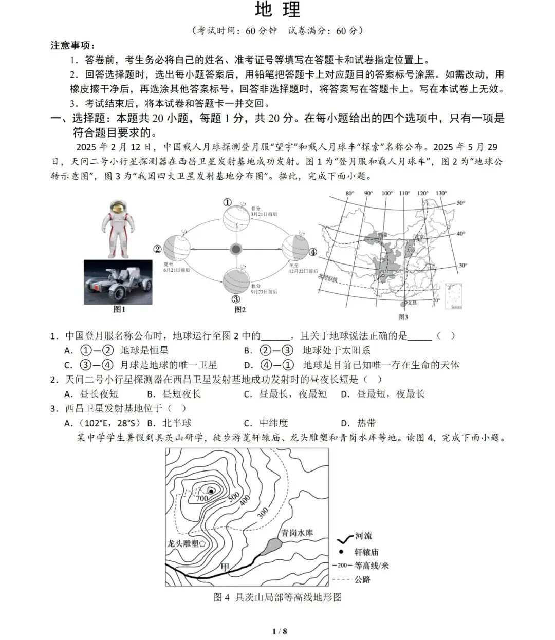 【解析】1.地球是行星,月球是地球的天然卫星,但不是唯一卫星,AC错误;中国载人月球探测登月服和载人月球车名称公布时间为2025212日。图2中,代表春分(321日前后),代表冬至(1222日前后)。212日位于冬至(1222日前后)和春分(321日前后)之间,对应地球运行在④—①之间,D正确。故选D