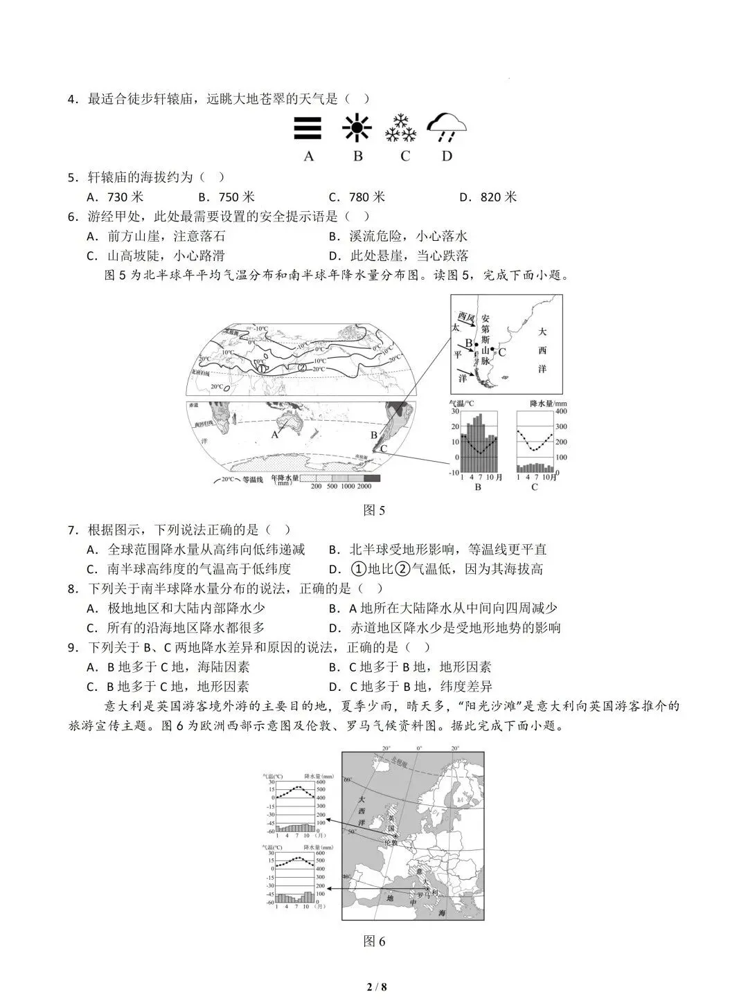 【解析】4.先看四个天气符号:A图雾天,能见度低,不适合远眺;B图晴天,天气晴朗,能见度高,适合徒步和远眺;C图雪天,气温低,且会影响视线,不适合徒步;D图为中雨,有降水,不适合徒步。所以最适合徒步轩辕庙、远眺大地苍翠的天气是晴天,B正确,ACD不符合题意。故选B