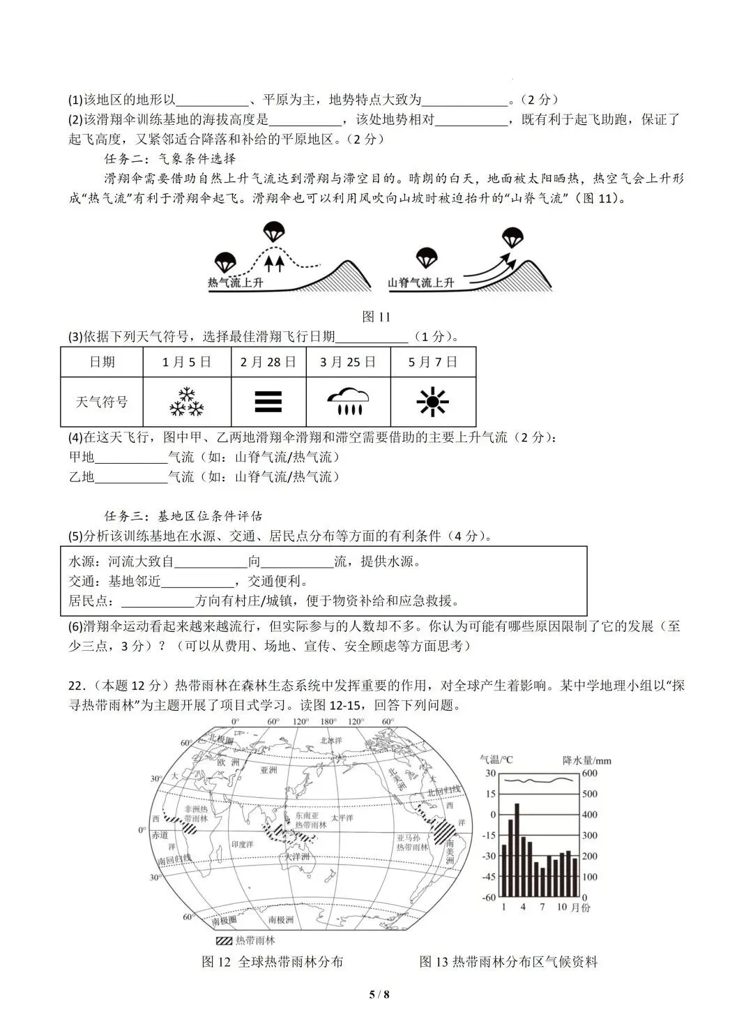 3)滑翔伞需晴朗天气的上升气流,分析天气符号:15日降雪、228日有雾、325日降雨,均不符合;57日为晴天,符合飞行条件,故最佳日期是57日。