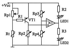30.如图所示为小明设计的烙铁架温度指示电路。热敏电阻Rt安装在烙铁架上,当将工作中的电烙铁放到烙铁架上,温度上升达到设定值时LED1发光;当电烙铁离开烙铁架时LED2发光。请完成下列各题: