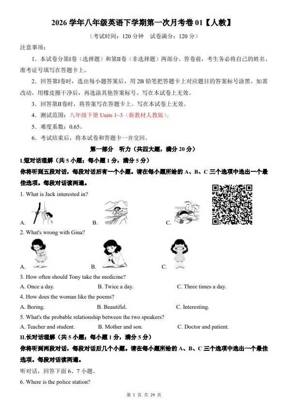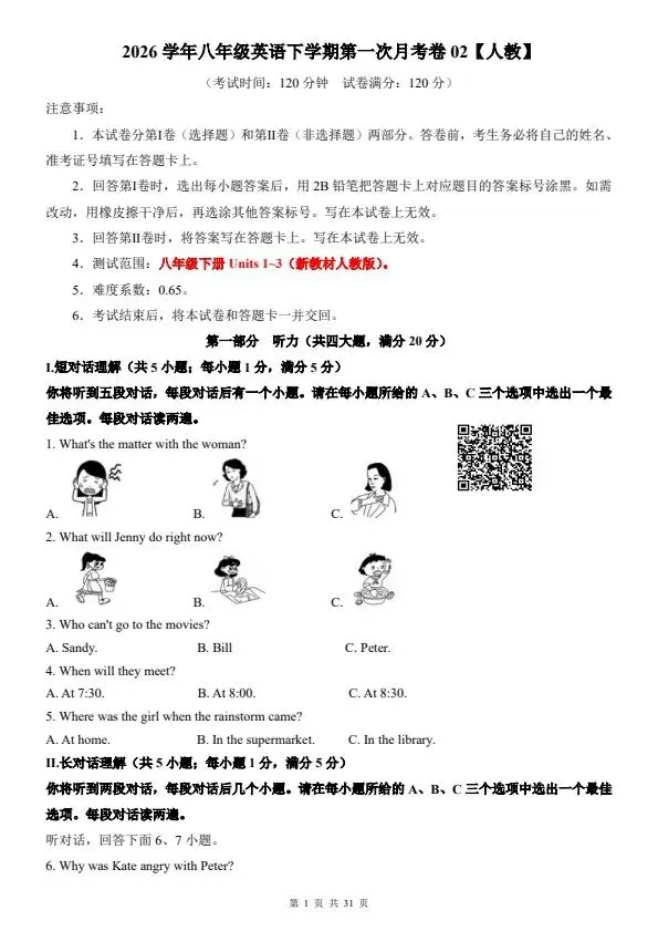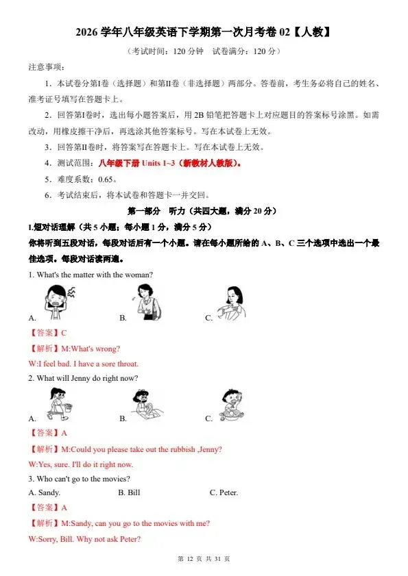 今日分享2026八年级下册英语人教版第一次月考试卷2套(含答案)完整电子版可打印!所有资料均为高清电子版,排版规整适配打印,不用费心整理,直接打印就能用。精准击破学习难点,帮孩子夯实基础、吃透考点,稳步提升学习效率!