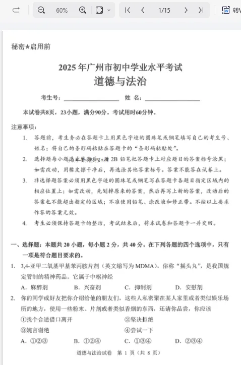 2025年广州中考道法真题试卷+答案